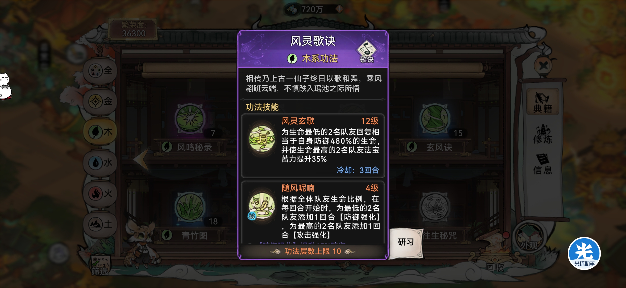 这本功法还是不错的,有治疗同时可以提升队友的法宝蓄力,而且被动还可以给残血队友加防御,给生命最高的队友提升攻击。