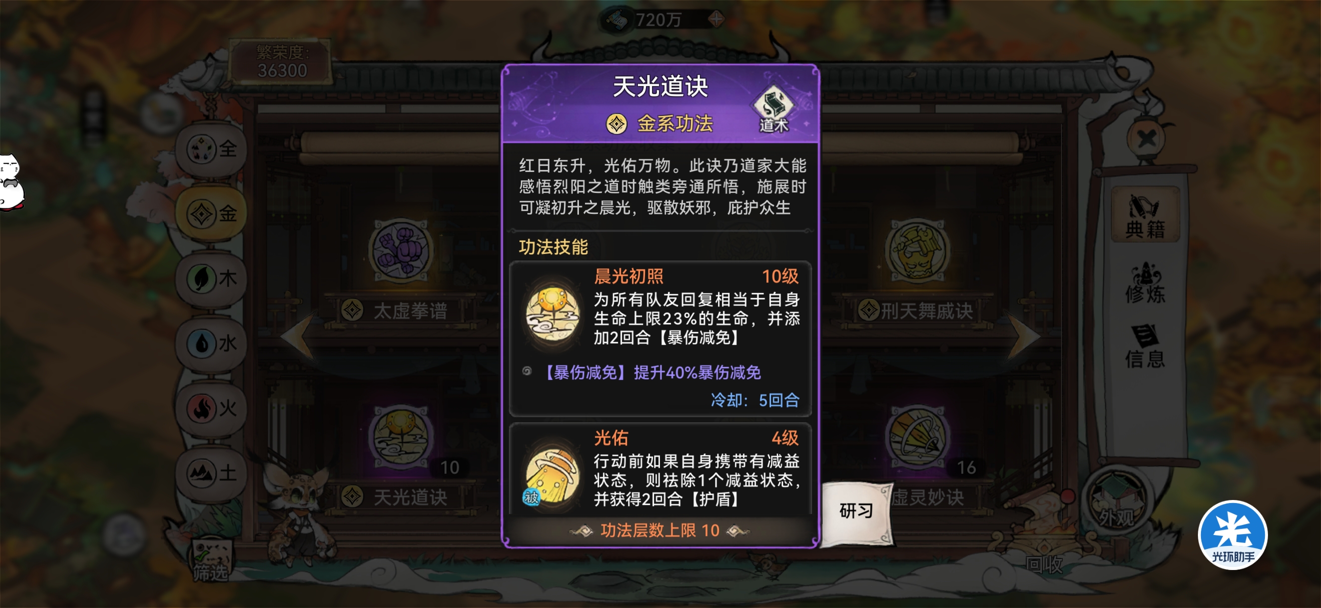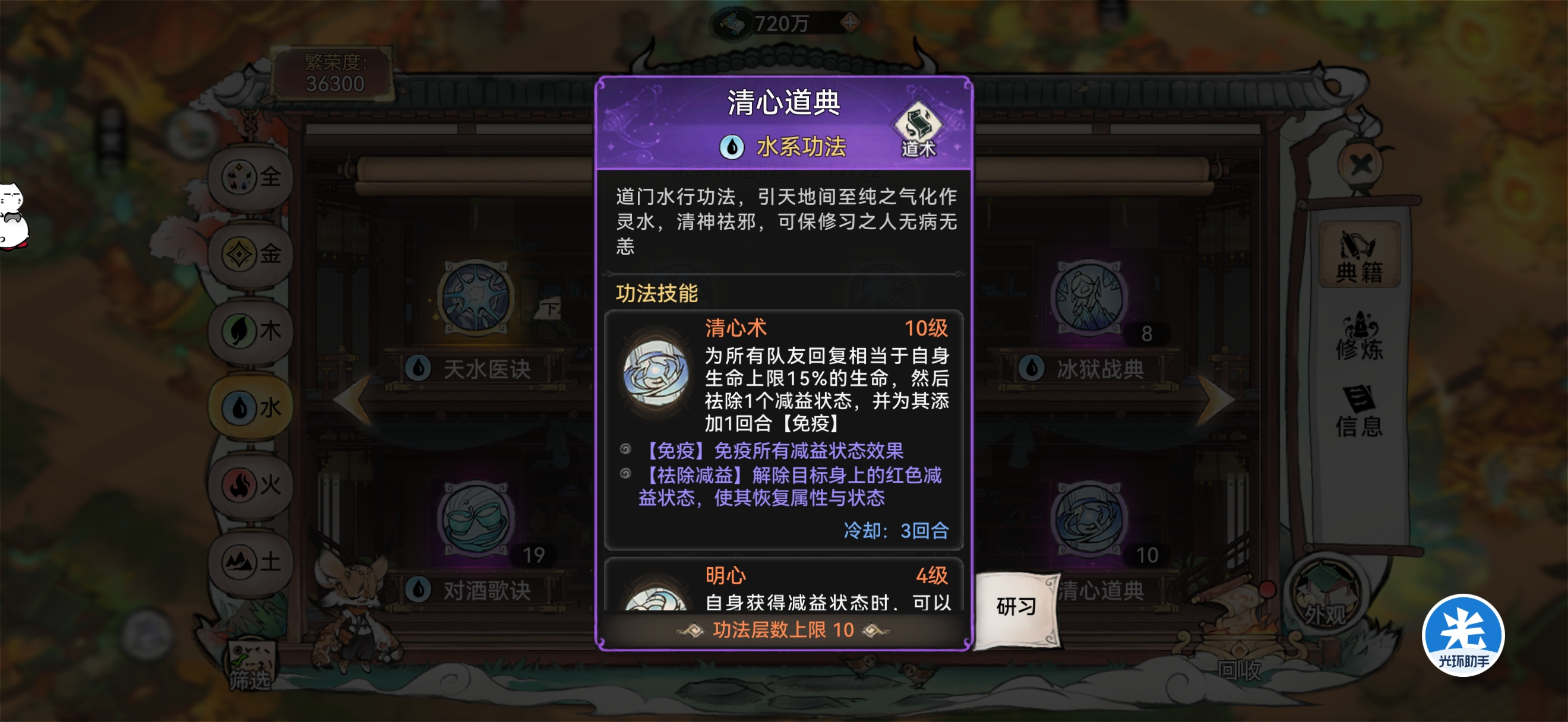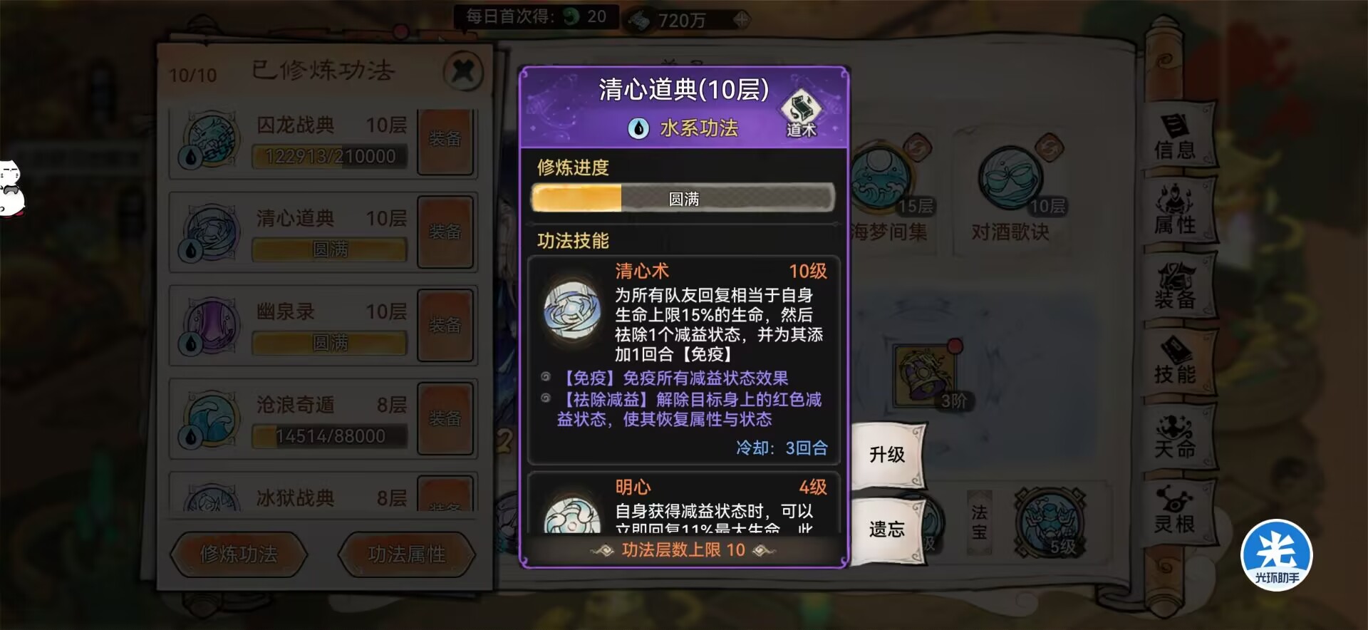 这本功法前期用还不错,给全体队友回血和提升爆伤减免,被动可以帮助自己祛除减益和加护盾。