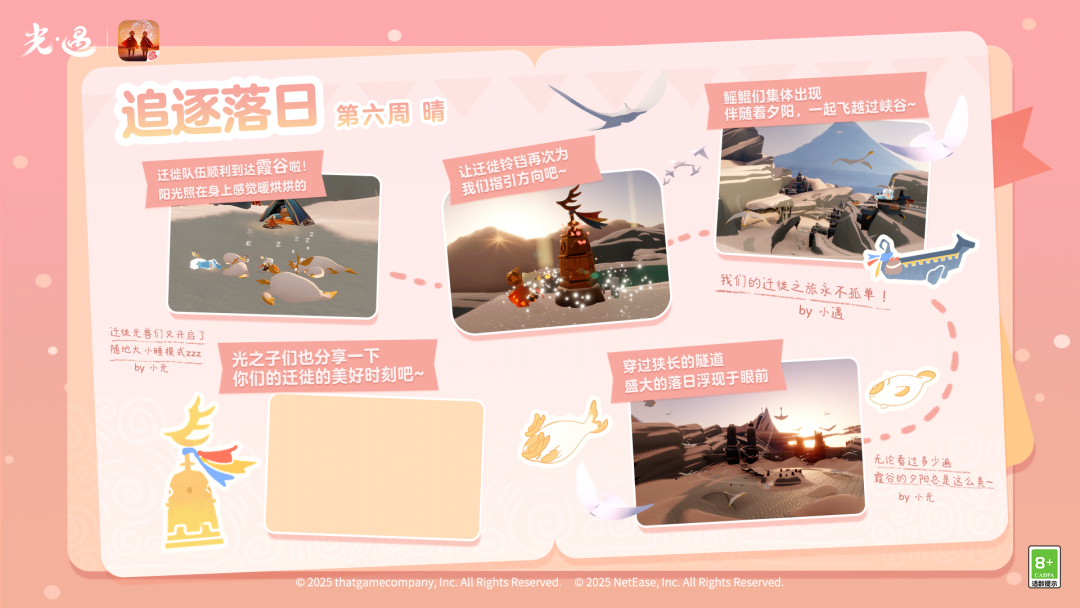 迁徙季任务六已开启|沐浴霞光,与落日同辉是泽哦发布于 11-29关注追着和煦暖阳抵达霞谷摇响铃铛指引旅途方向与鲲群飞过狭长的隧道共赏熔金落日铺染长天🌅奇妙之旅:迁徙季任务六已经开启小光小遇将沿途风光写进日记快在评论区分享迁徙途中的美好时刻吧