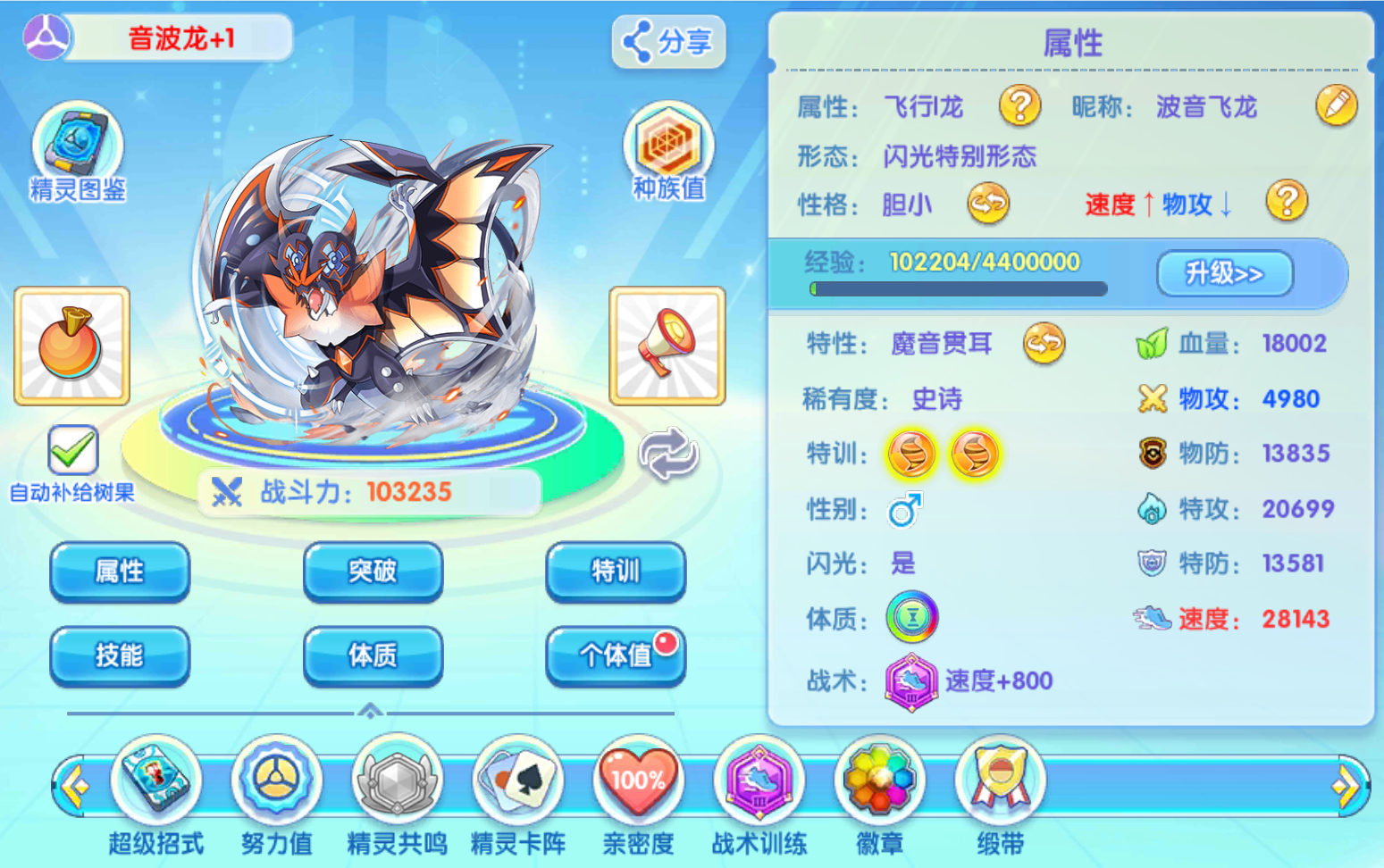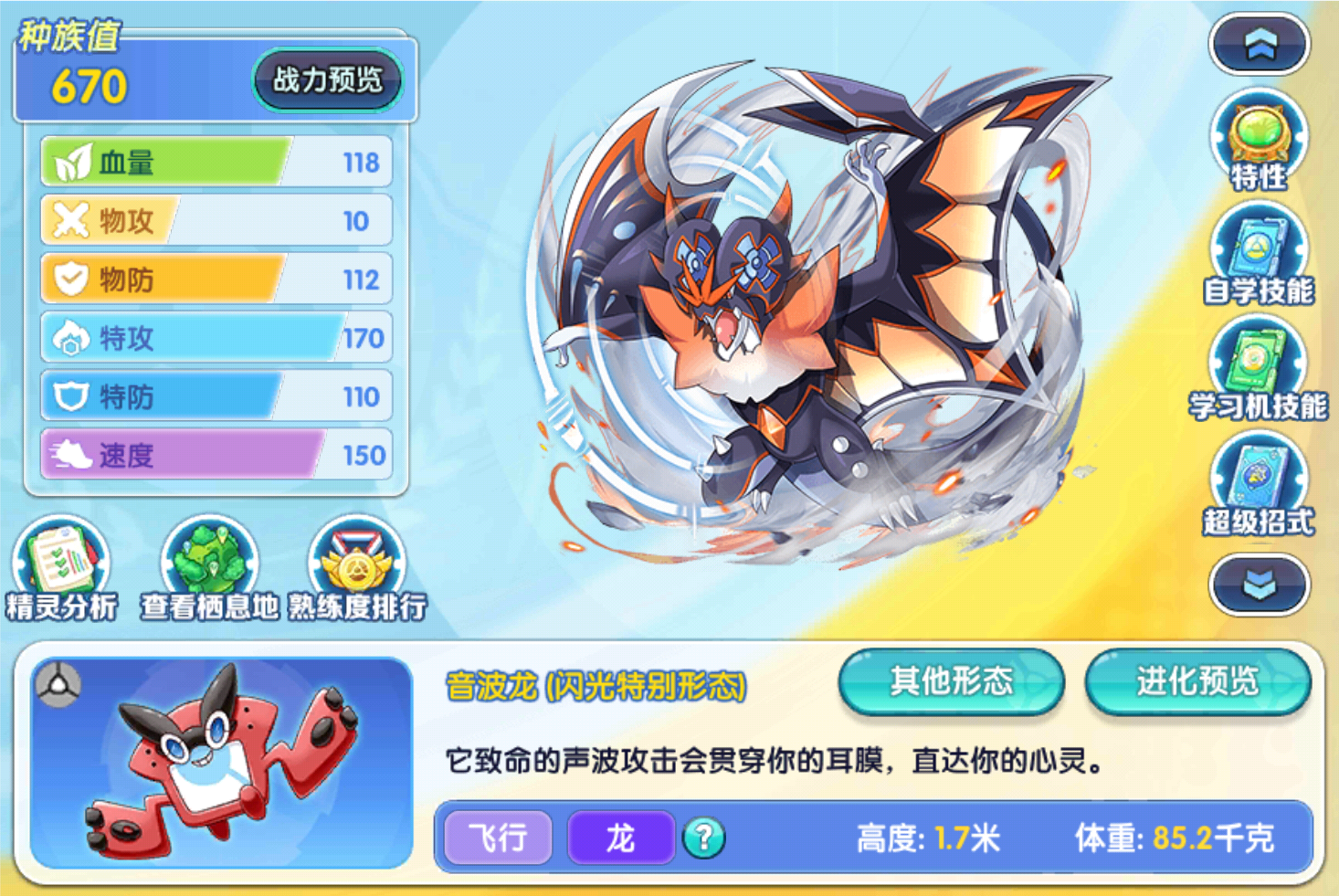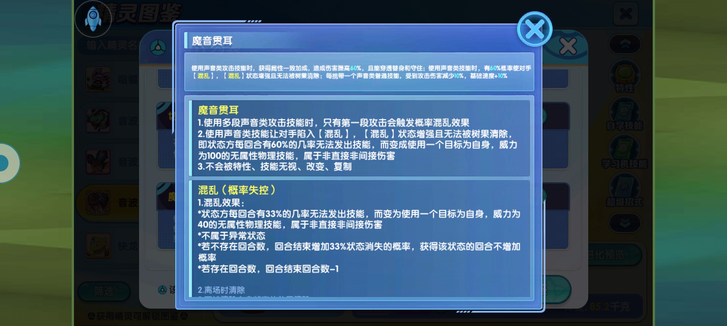 特性方面的话,全部和声音类招式有关,所以这个宠物的技能,必须要全部搭配声音类招式才行,至于特性效果的话,那就非常的简单粗暴,直接增加60%的伤害,并且让对方进入混乱,而且这个混乱是加强过的,原本混乱是可以用果子给解除的,但是这下不可以,并且当对方有60%的概率自己打自己,这里将原本的40无属性物理威力升级为了100无属性物理威力,还有就是使用声音类招式的时候会有一致加成,也就是说如果声音类招式以后越出越多,对于这个精灵来说有着非常大的加强趋势,用自身的打击面就不缺了,但还是那句话,就算以后把18种声音招式全部搞出来,也没有他的份了了。