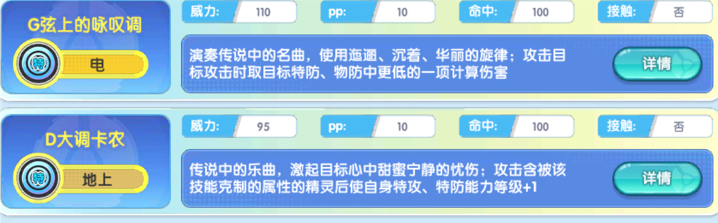 这两个技能可以全都上互相弥补各自的弱点,比如说飞行打不了地上,那么就用地上系去打,那么地上系打不了飞行,就用电系去打,二且两个技能都有各自的效果一个是根据对方防御中最低的一个进行伤害计算,另外一个则是有机会提升自己的能力,两个一起用的话就是一个另类玩法的摇滚皮卡丘,至于龙系技能的话,可以考虑掷地有声因为这个技能的话,也是可以根据自身的属性来改变技能的属性而且还是声音类的招式,所以也是必带的,还有一个技能的话就是被动的命运交响曲,效果是能够让自身有机会回血,但是副作用就是让自身陷入混乱。由于是被动技能,并且初始技能次数比较少,还需要磕药属于是最大的缺点了而且让自身陷入混乱,真的蛮尴尬的,搞不好的关键时候,自己把自己就给坑了。