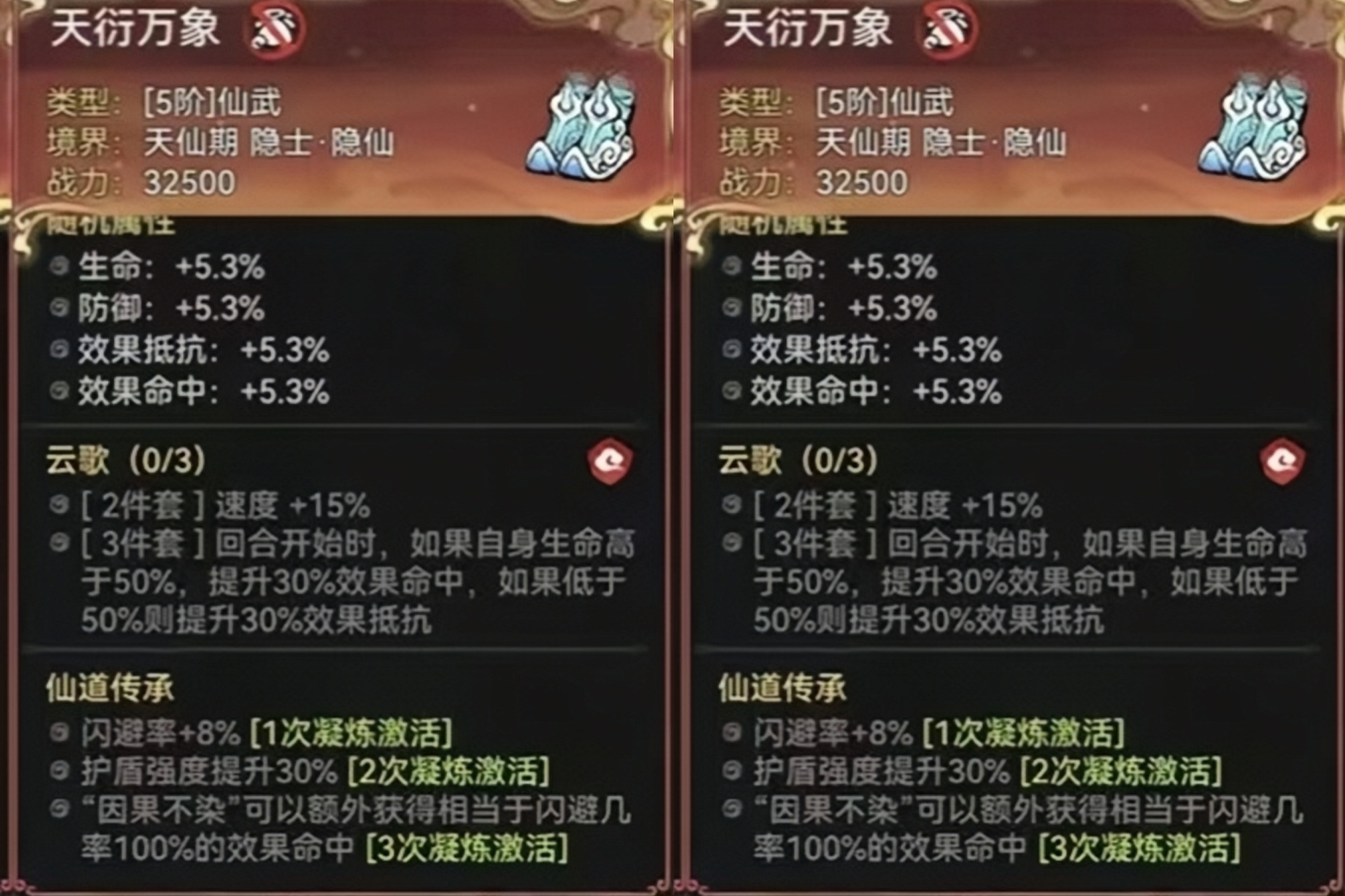 总结:这个仙装可以进一步提升仙隐的基础闪避率,配合上天命释放法宝提升35%闪避在加上仙职业【因果不染】被动闪避加成和【净月幻世录】【虚冥密卷】等功法闪避加成。