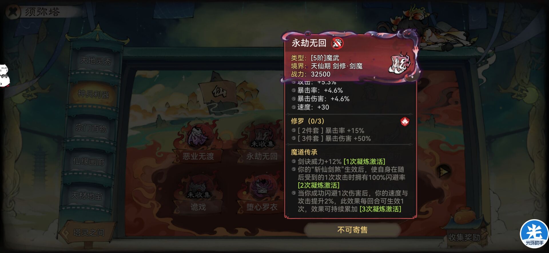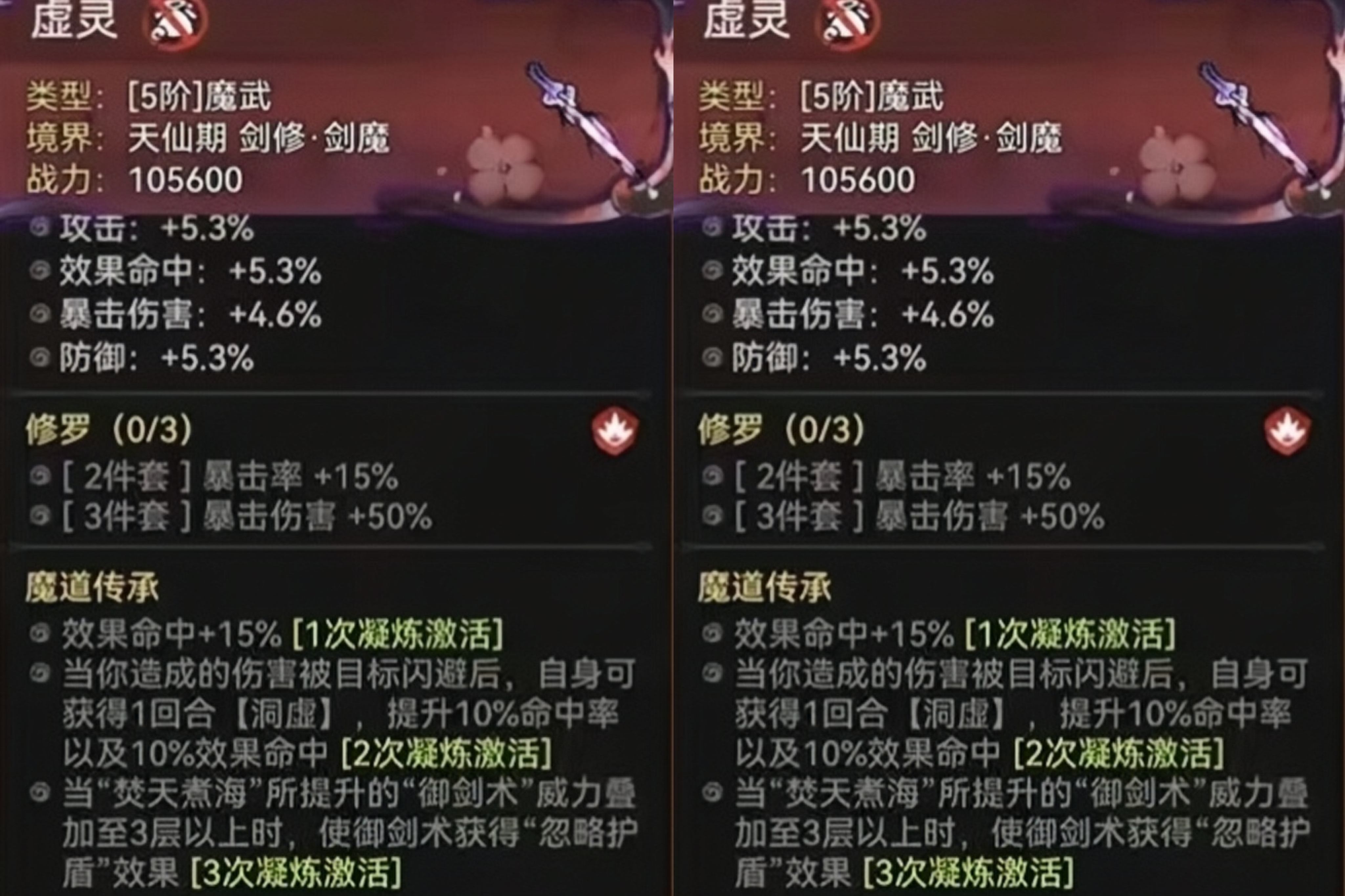 不过目前剑修的魔装有两件【虚灵】搭配上【永劫无回】两件魔装一起加成的话,对现在版本的剑魔也是一个大提升。
