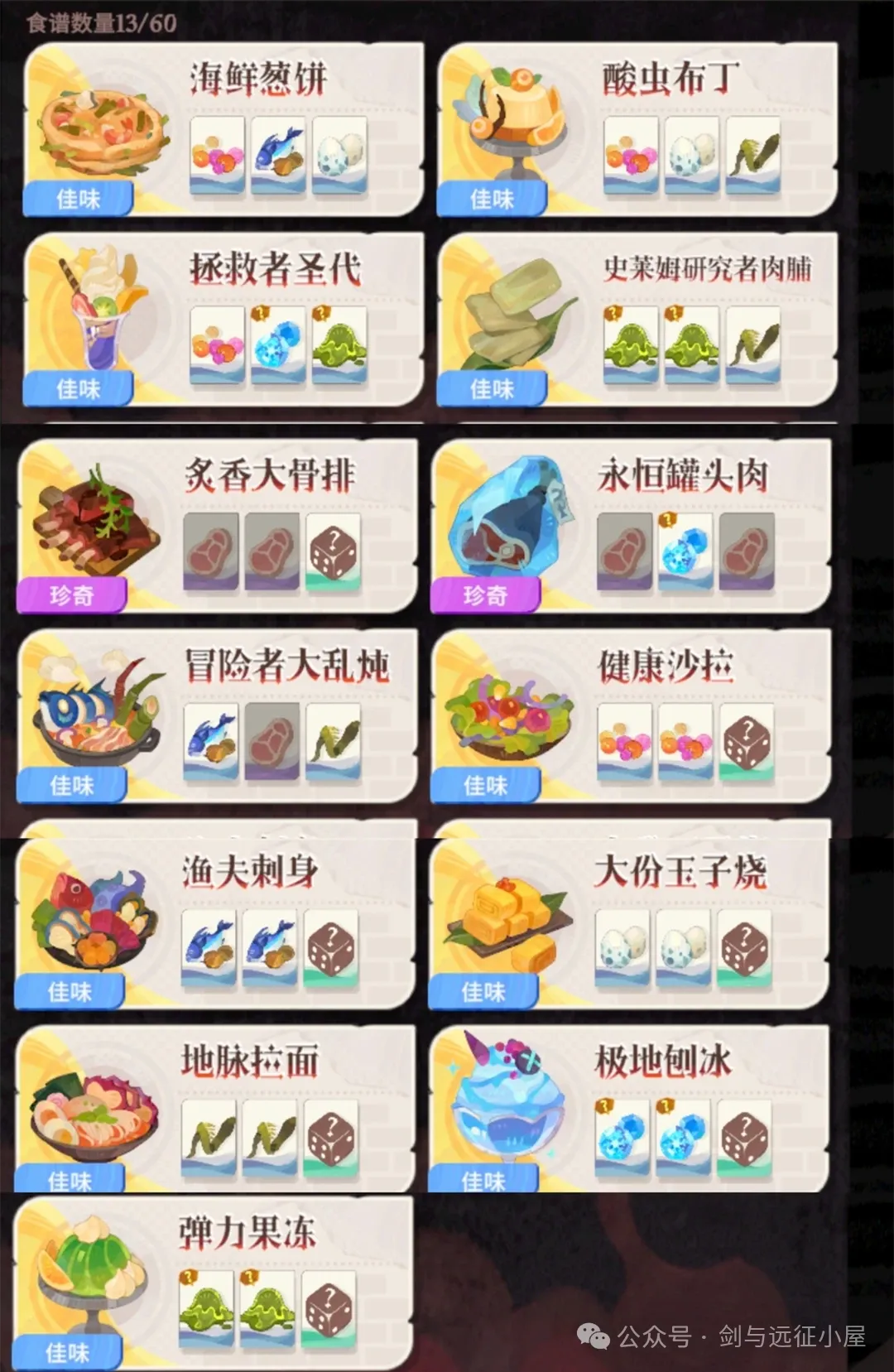 【启程】迷宫饭联动活动-魔物厨房食谱&膳食挑战奇景图一攻略剑与远征 - 攻略星发布于 11-30关注一. 魔物厨房食谱前13种(持续更新中)1. 调味品每种都可以加,不影响最终食谱,优先选择自己需要加的属性调味品!2. 食谱中问号骰子是加什么都可以,优先选择多余的食材 二. 膳食挑战奇景图一攻略 转载自:剑与远征小屋