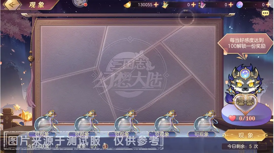 1、活动期间,小将军们每获得50点【每日任务】活跃度,即可获得观象道具「星象」*1。每日可观象上限为5次,并且于次日5:00重置上限次数。