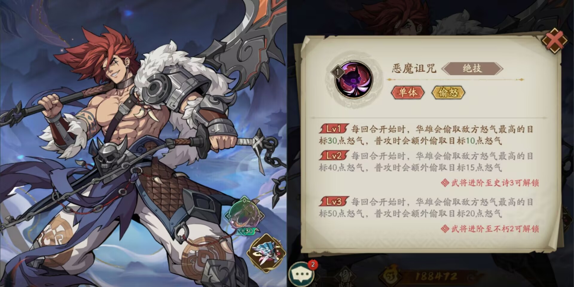 不过需要注意的就是不可抵挡敌人的:偷怒。比如:【华雄】这个武将决极就有偷怒的效果每回合开始就可以偷取怒气最高敌人50点怒气。