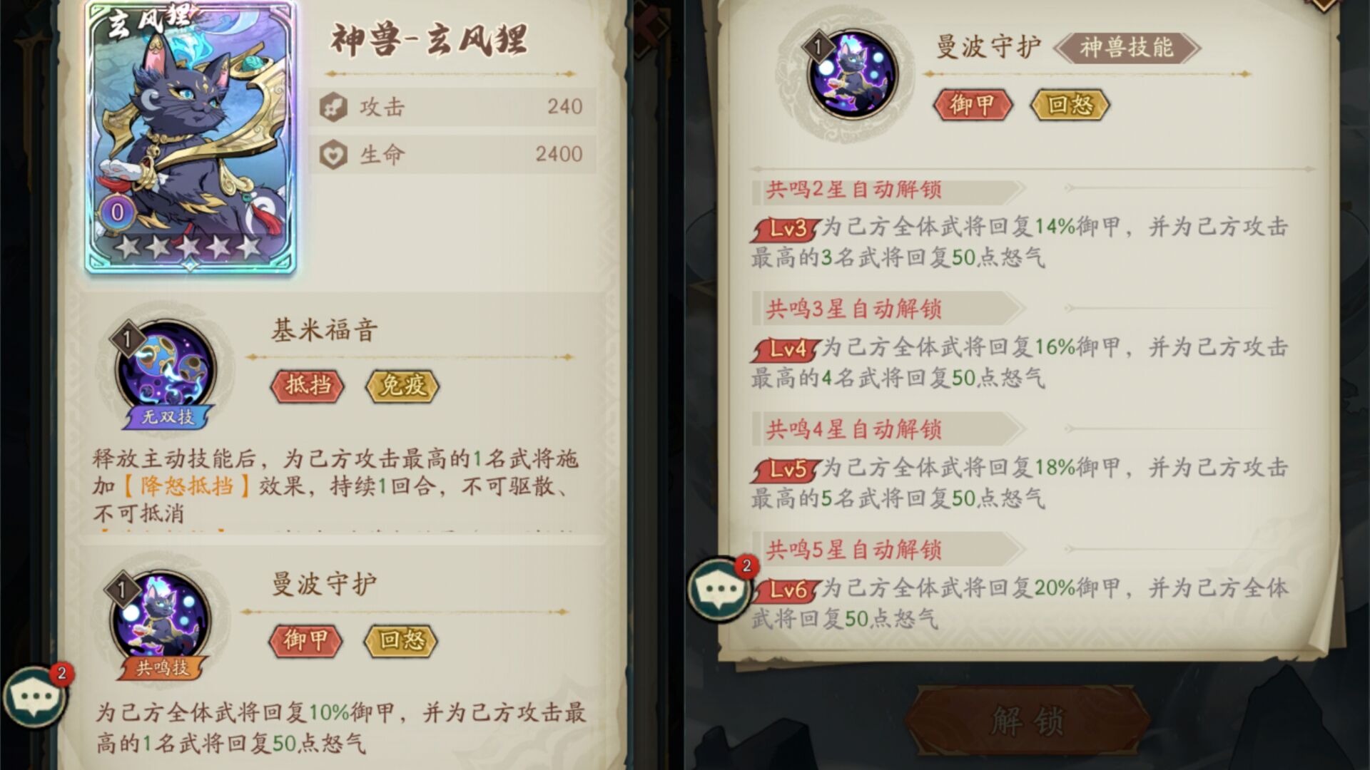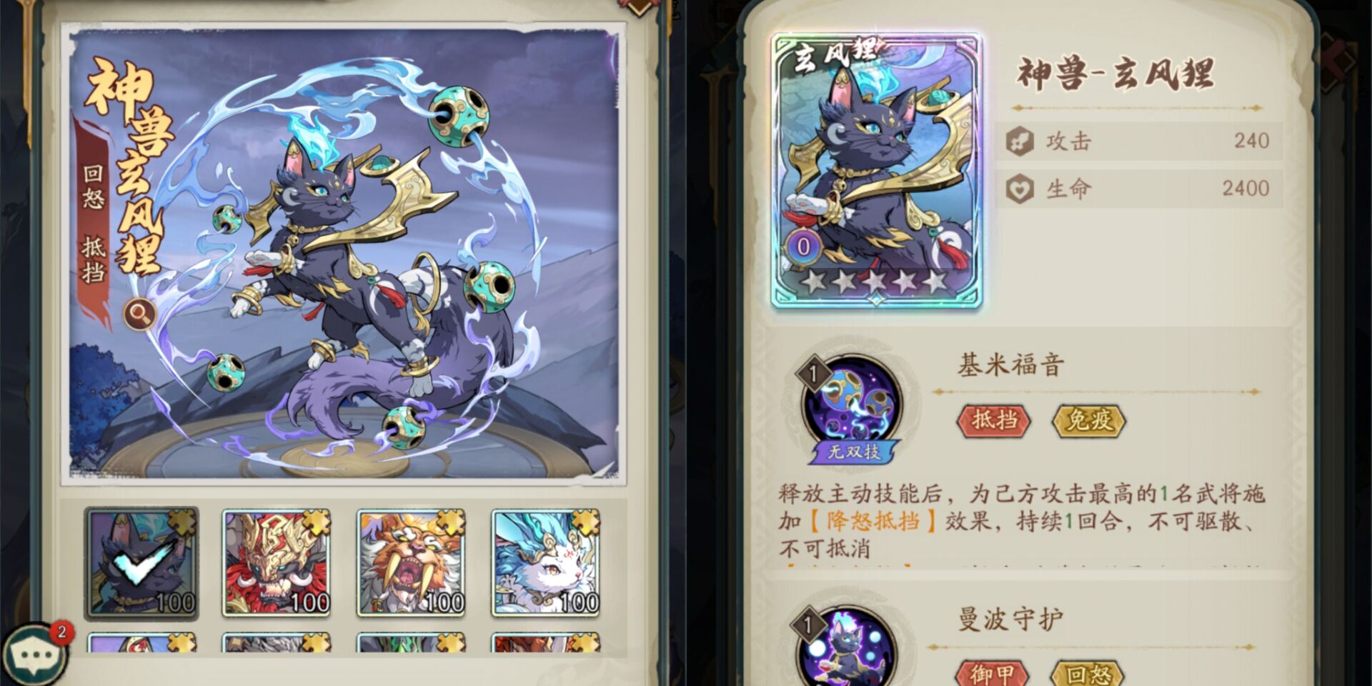 玄风狸0星=抵挡2次降怒(给1个队友)