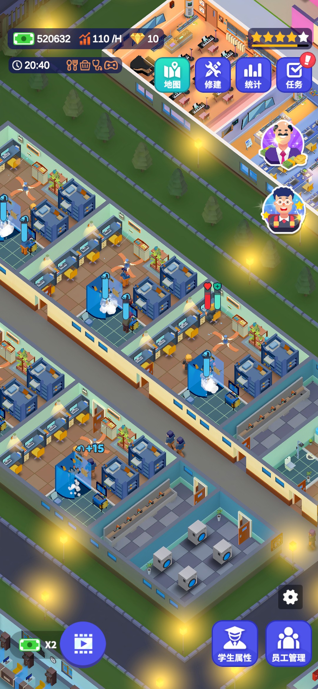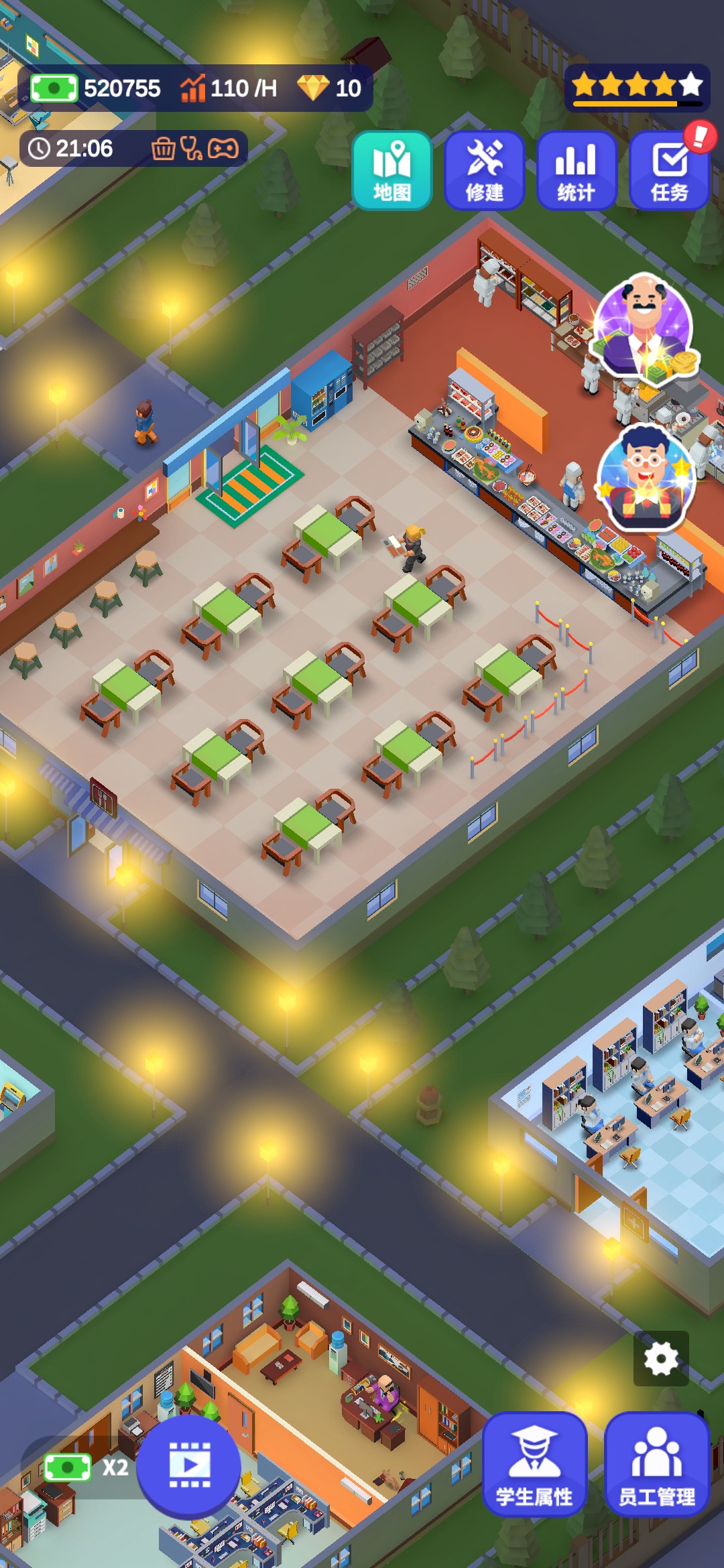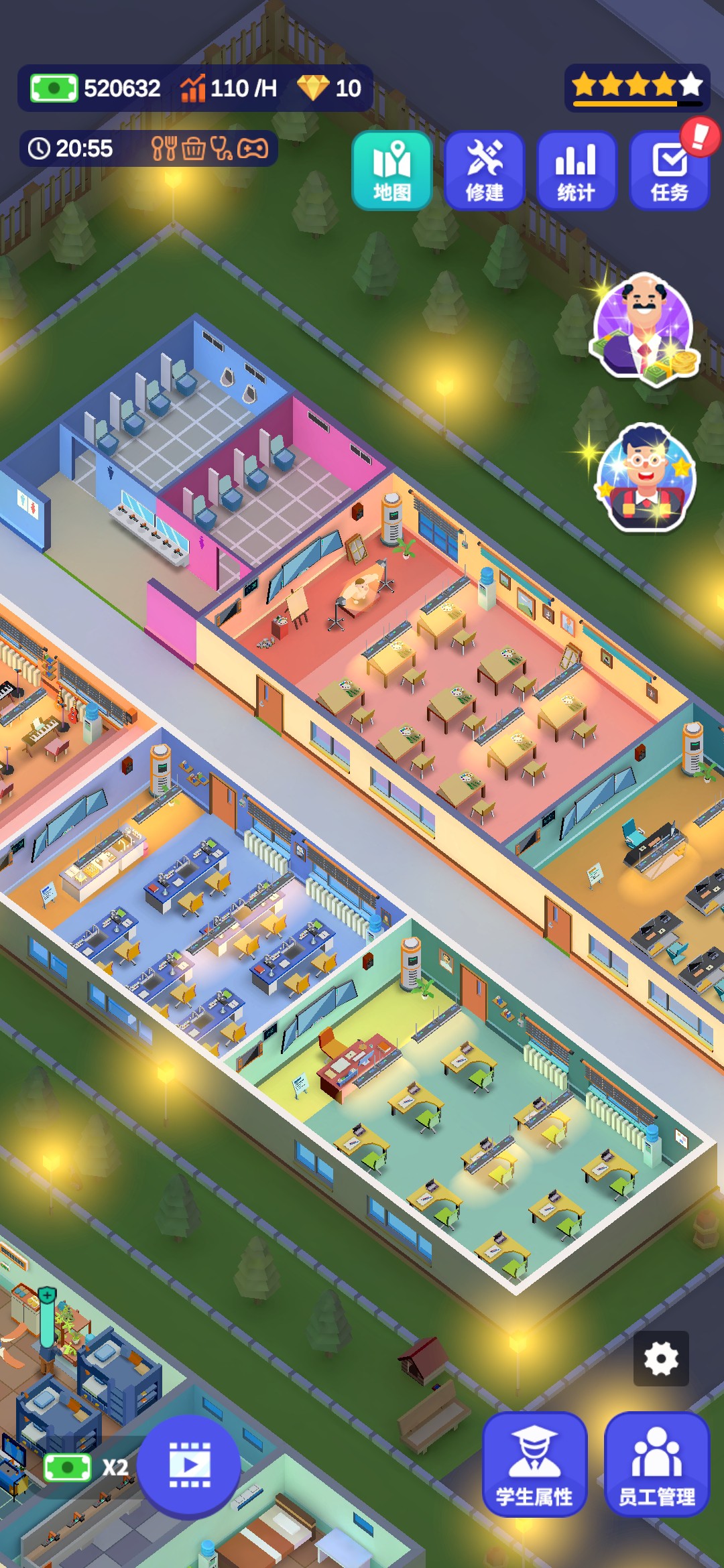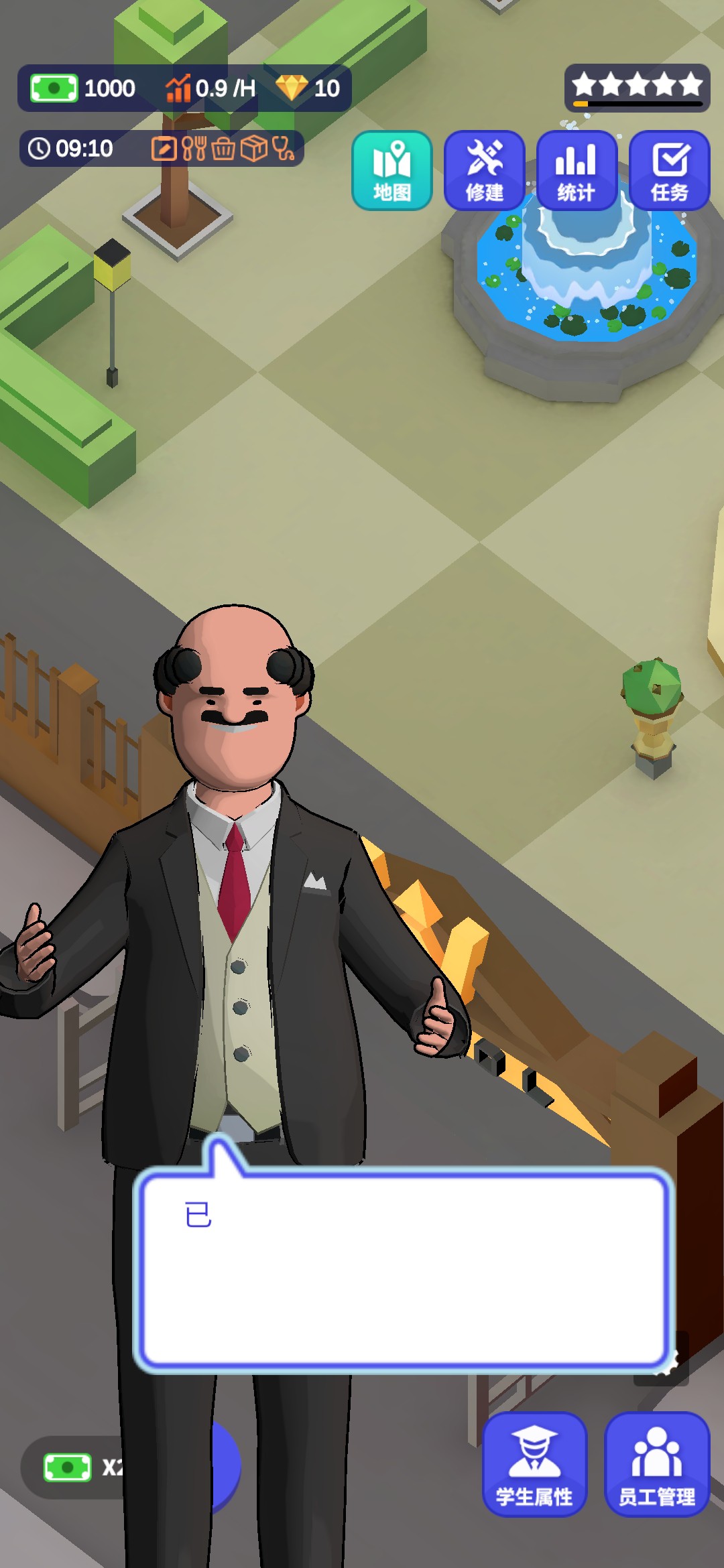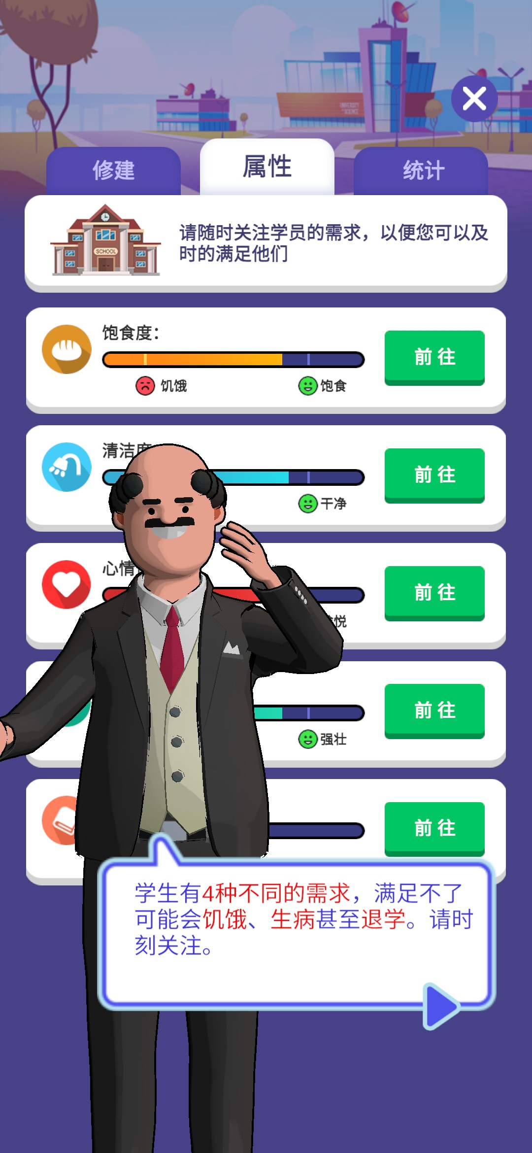 进入游戏,一位地中海的老大爷为我们进行了简单的游戏操作介绍。游戏的大致内容就是建造完善一所学校,让更多的人毕业完成学业,最后成功成为5星学校。