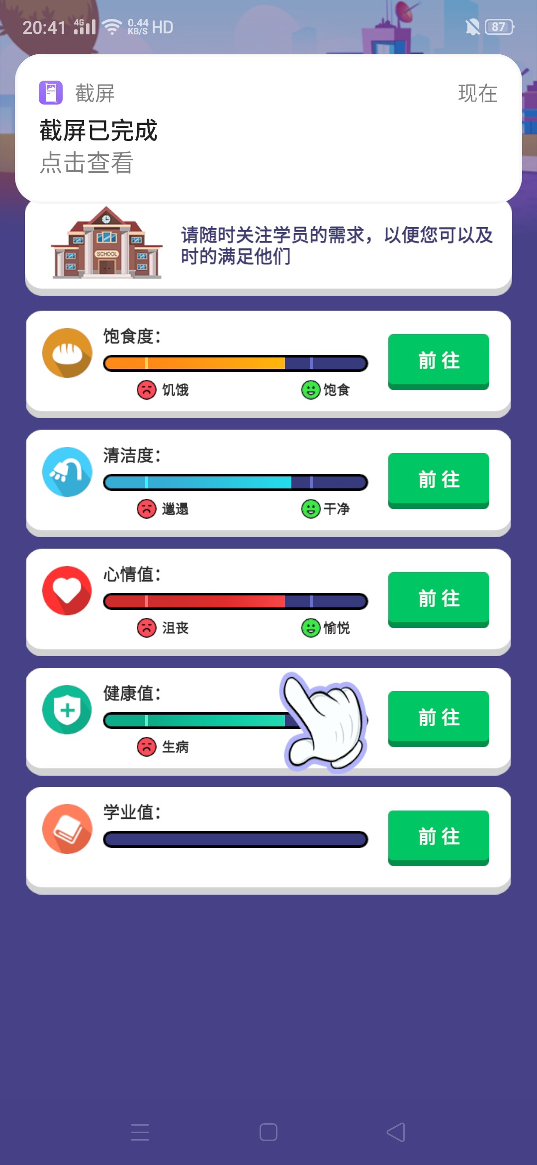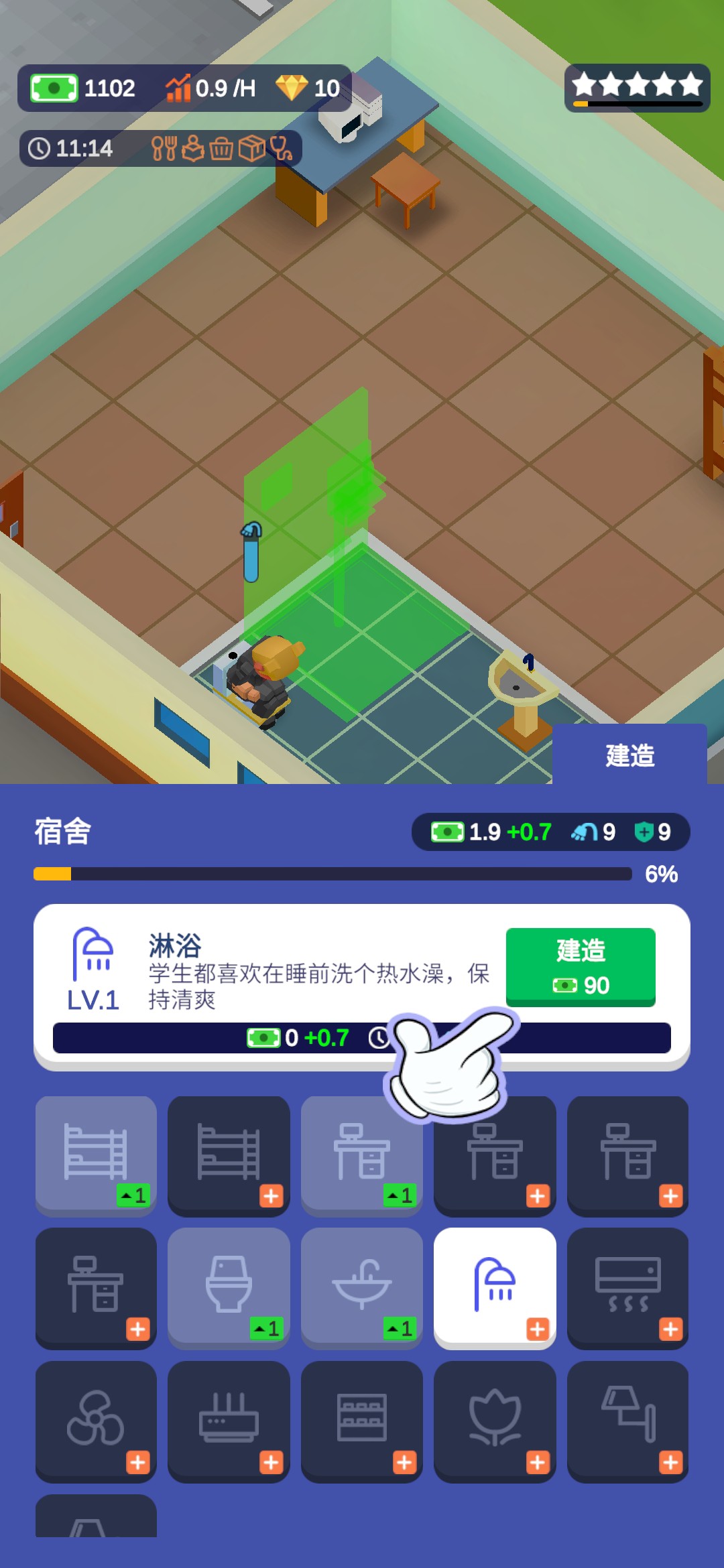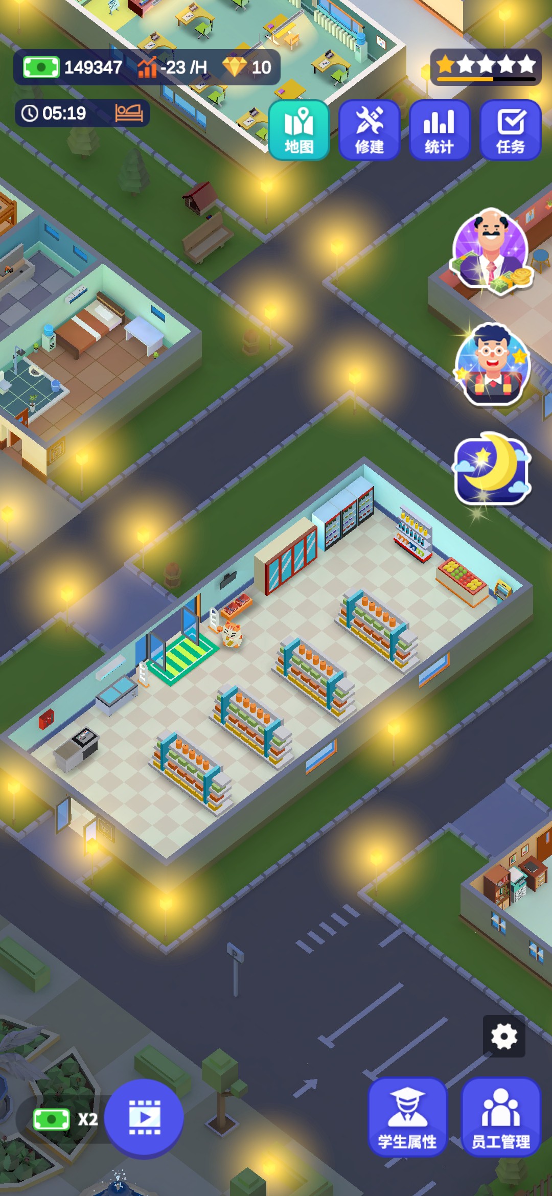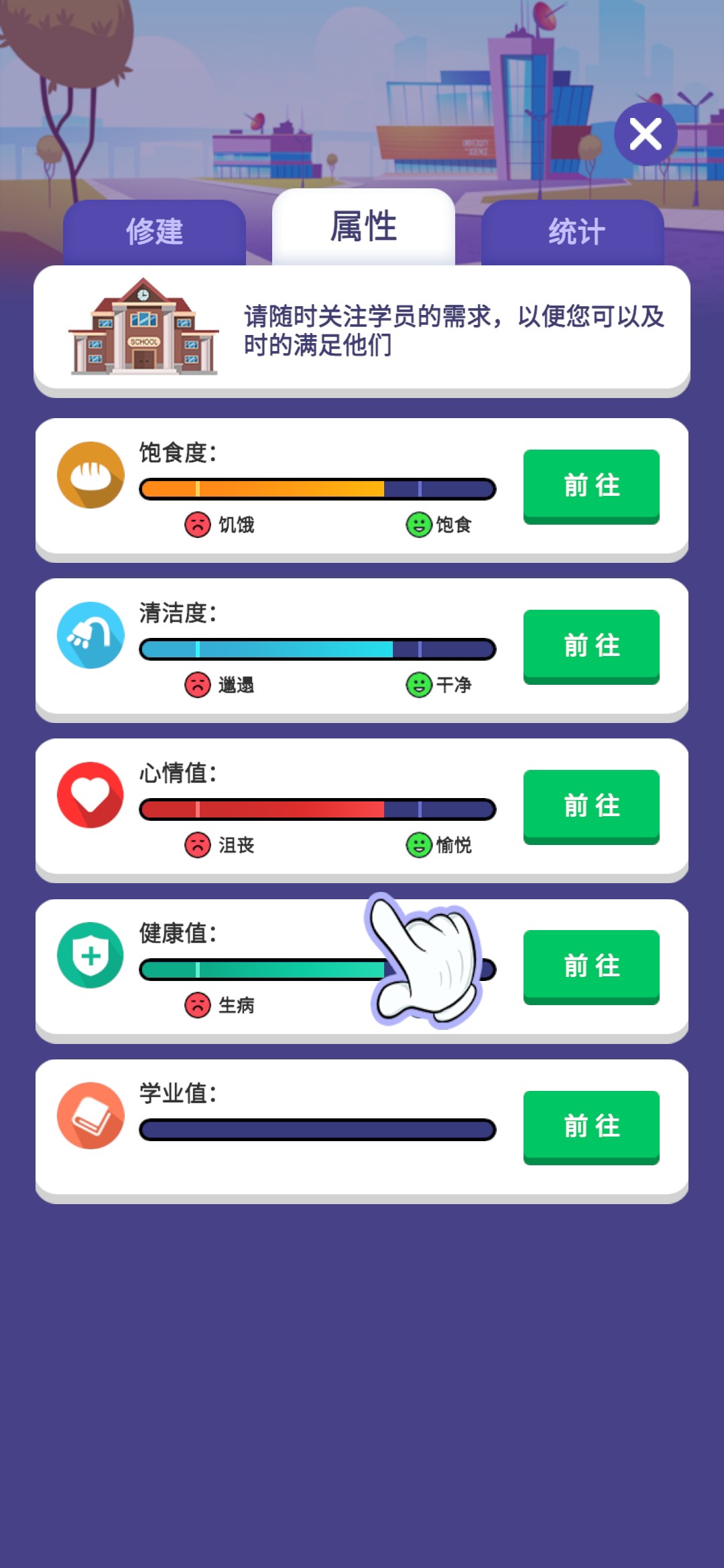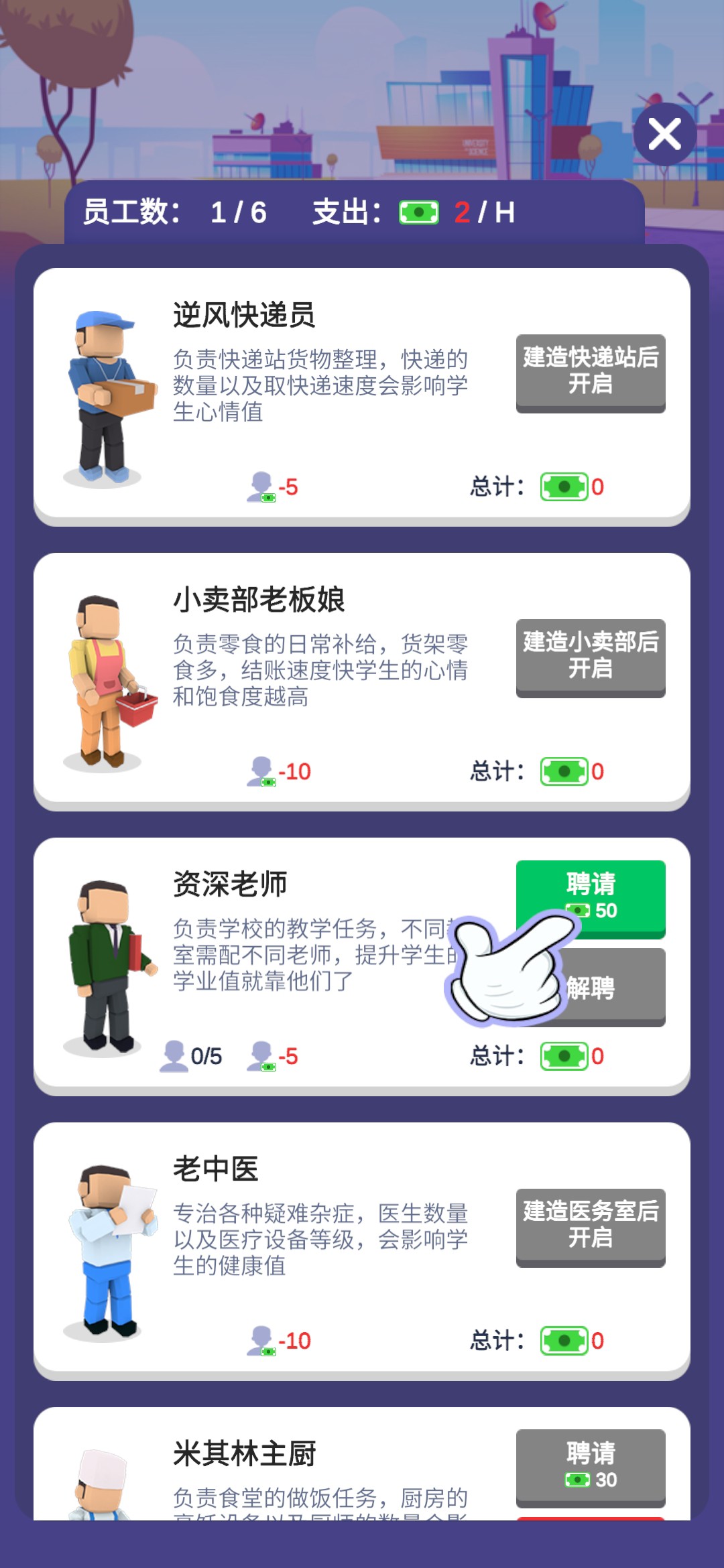 进入游戏,一位地中海的老大爷为我们进行了简单的游戏操作介绍。游戏的大致内容就是建造完善一所学校,让更多的人毕业完成学业,最后成功成为5星学校。