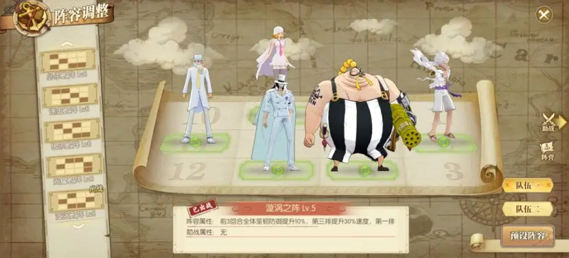 阵容一:5档路飞、未来岛鲁兹、未来岛卡古、未来岛斯图西、昆因 助战:速度助战
