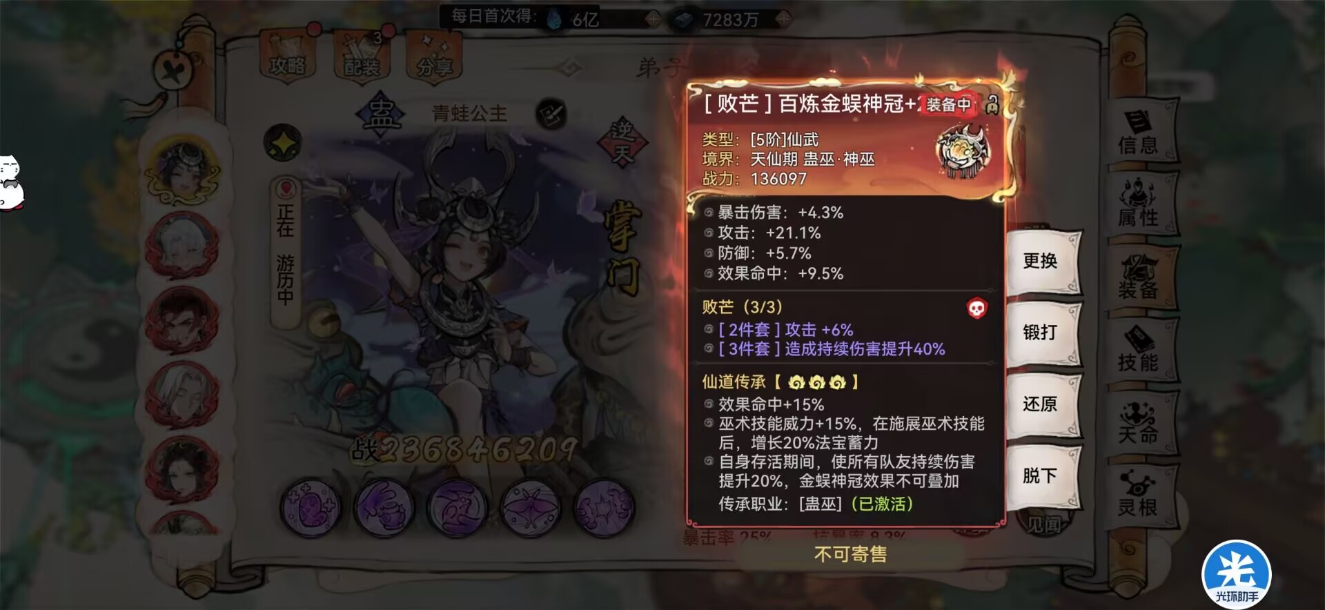 仙装为:【金蚣神冠】推荐优先凝练3阶。