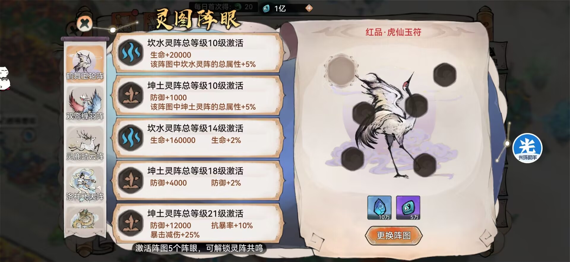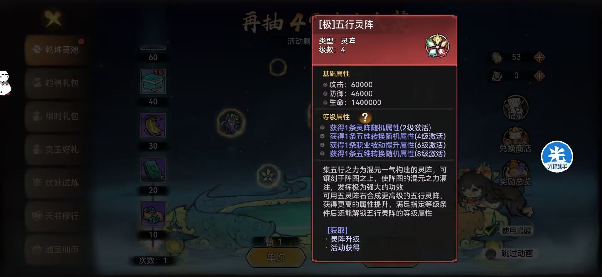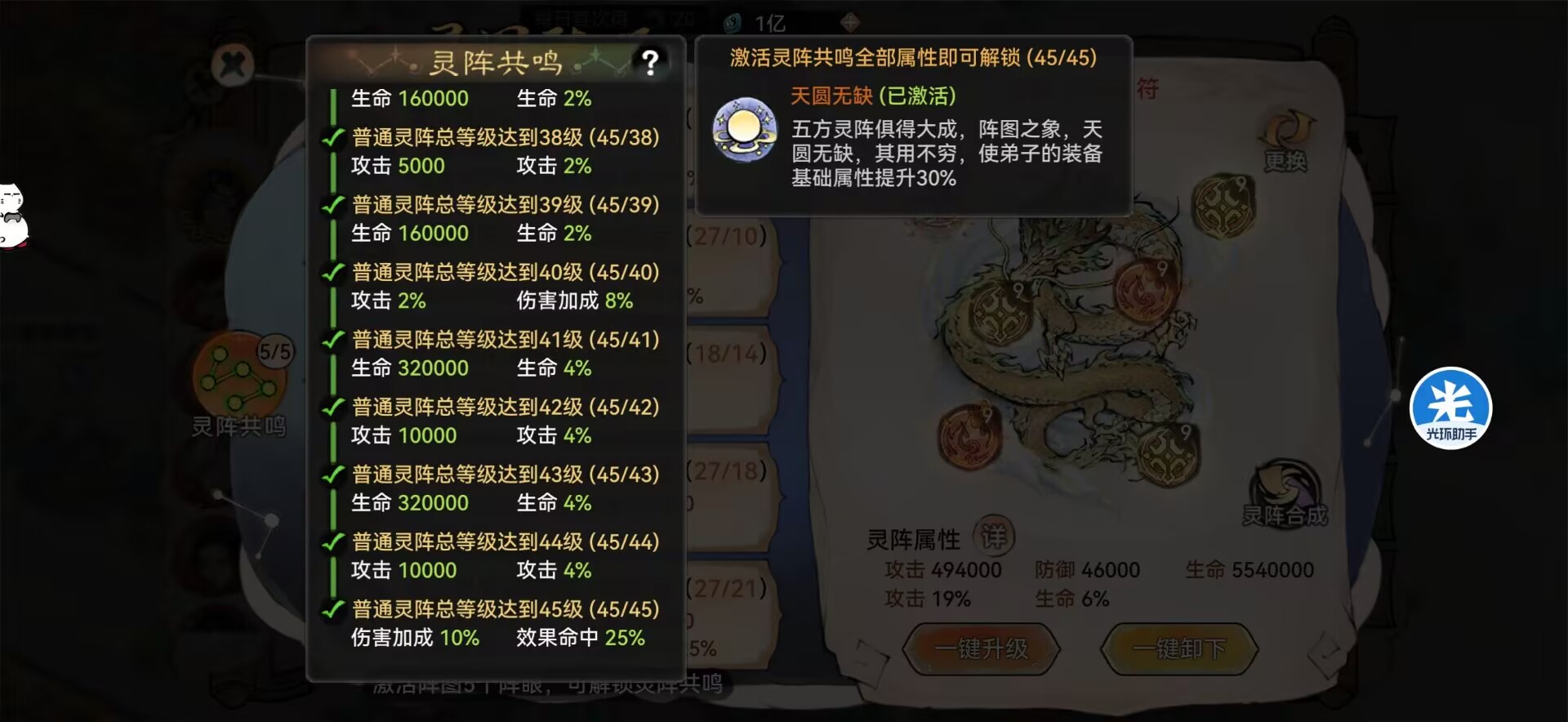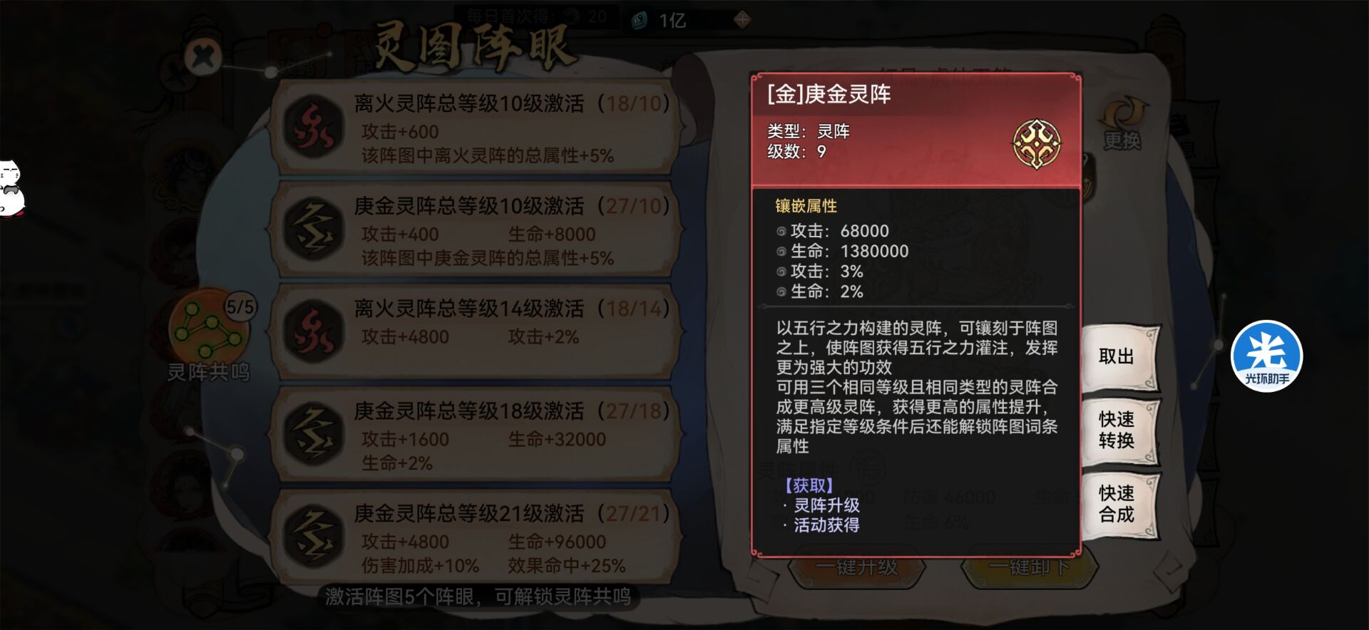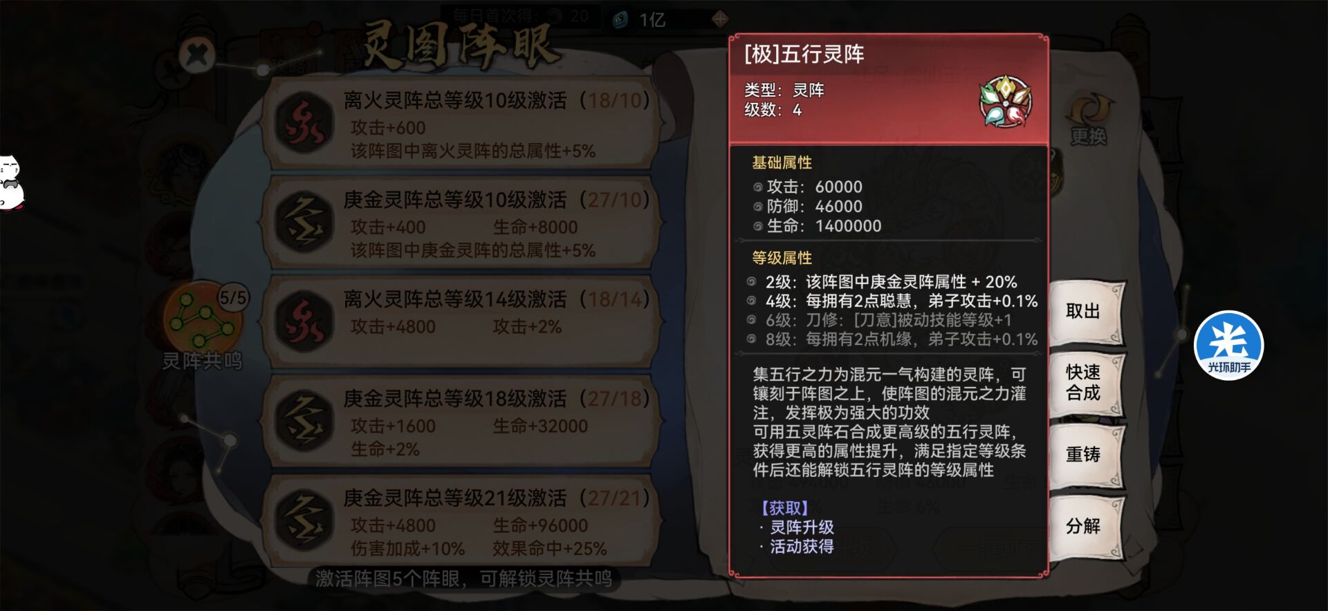 其中还有个叫做【五行灵阵】五行灵阵可以额外提升我们的属性,主要核心点在于等级。