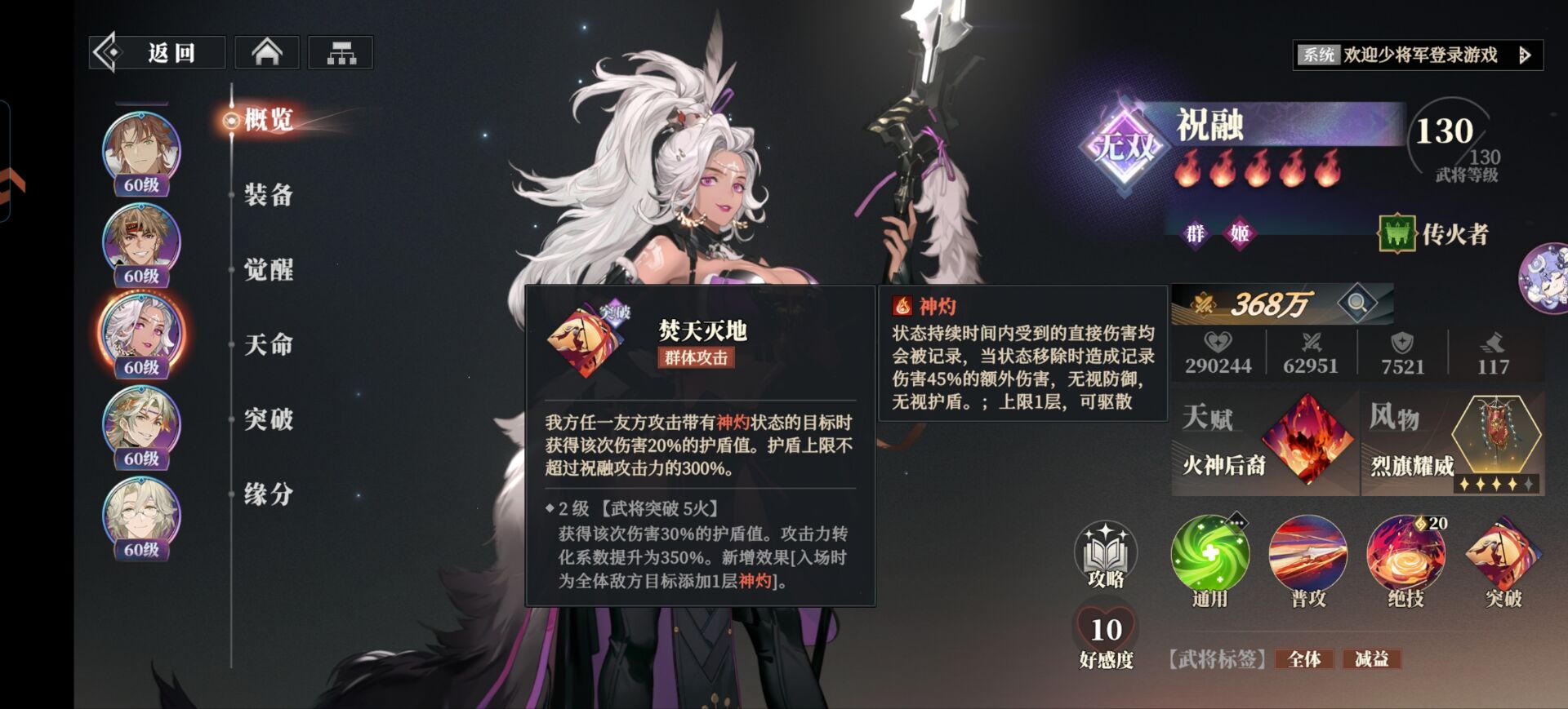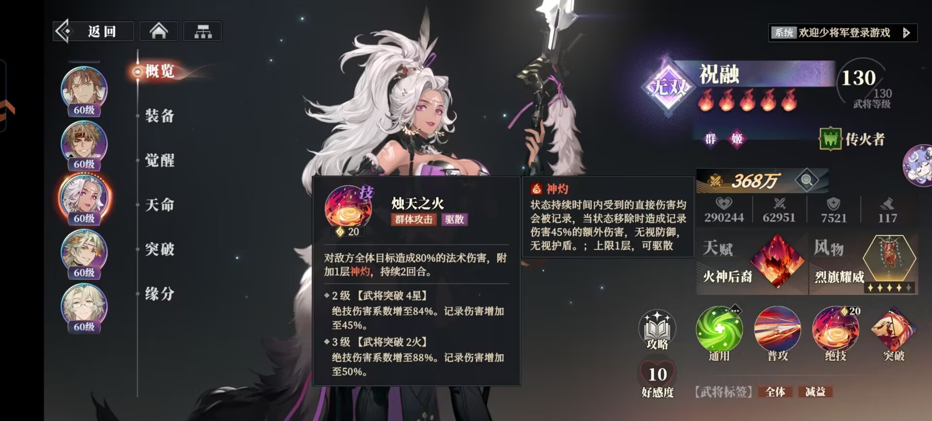 主要就是祝融在释放绝技对全体敌人施加【神灼】状态的时候可以通过天赋额外给目标施加2回合的【怒焰】。