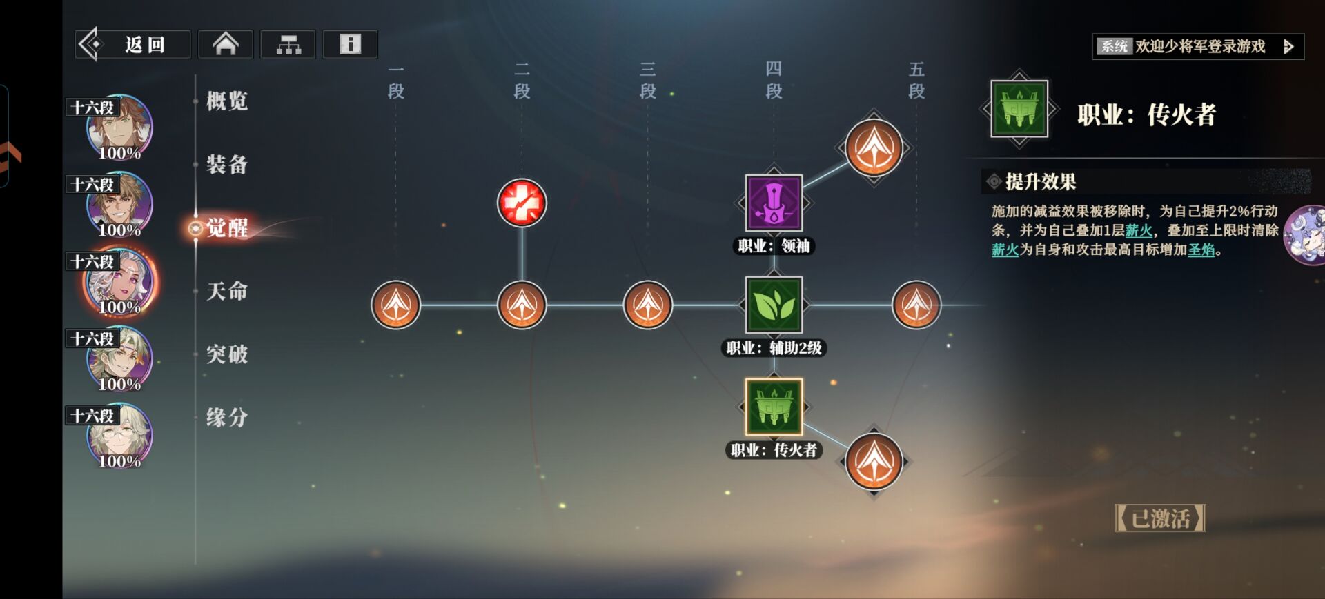 只要祝融施加的减益被移除,就可以提升自己2%行动条和1层薪火,配合上绝技神灼可以快速给自己拉条和叠薪火。