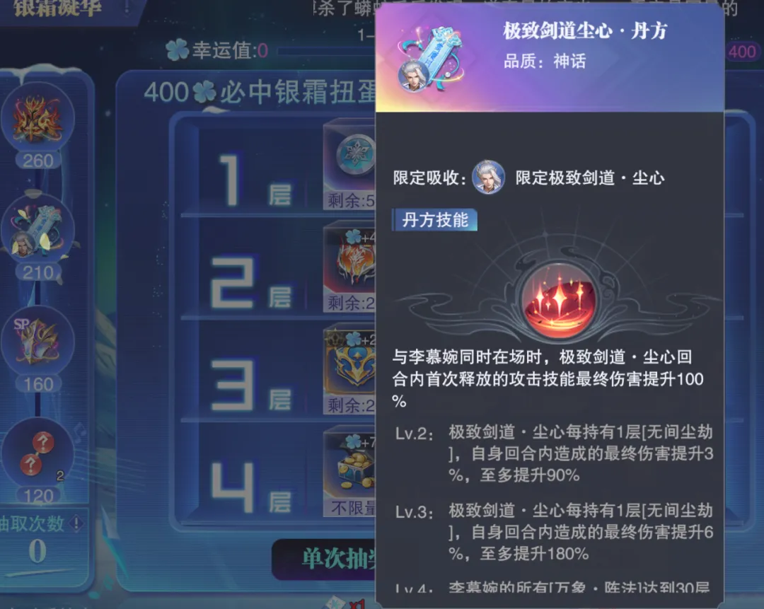 首先是需要210抽累抽才能获取的SP+尘心的丹方,目前围绕着李慕婉的丹方系统也是官方盈利的一大核动力,所以其普遍都会给到一个较高的成本,而这波的210抽嘛......的确也不太容易,待会在计算成本环节我们再说具体的成本。