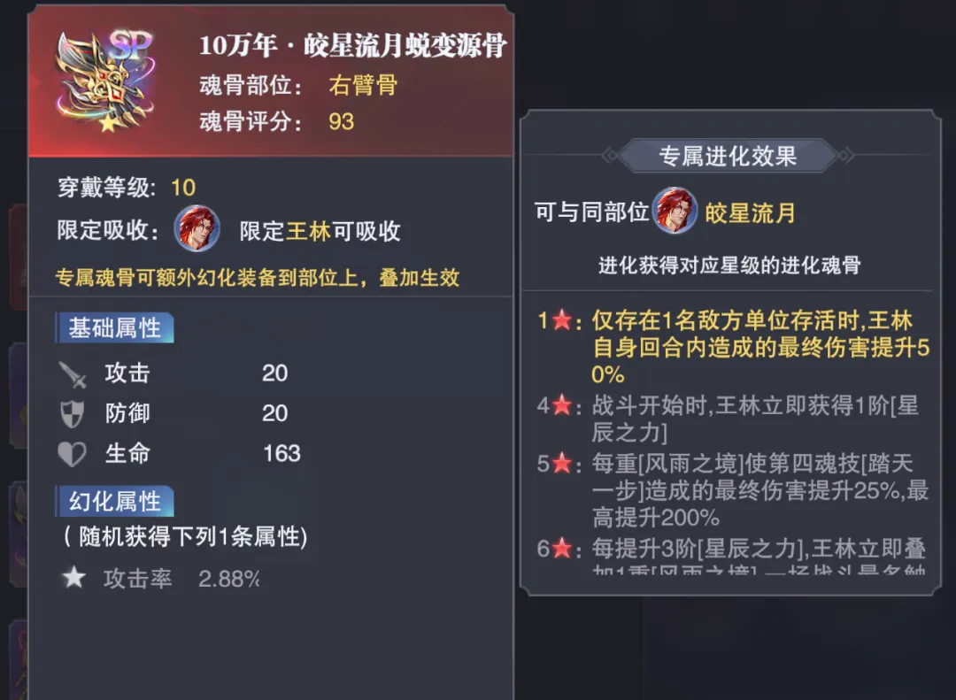 接着还有25抽扭蛋机可以保底获取的SP王林右臂进化魂骨,核心功能依然是提升王林的增伤水准,并无关键的质变机制效果,大家量力而行即可。