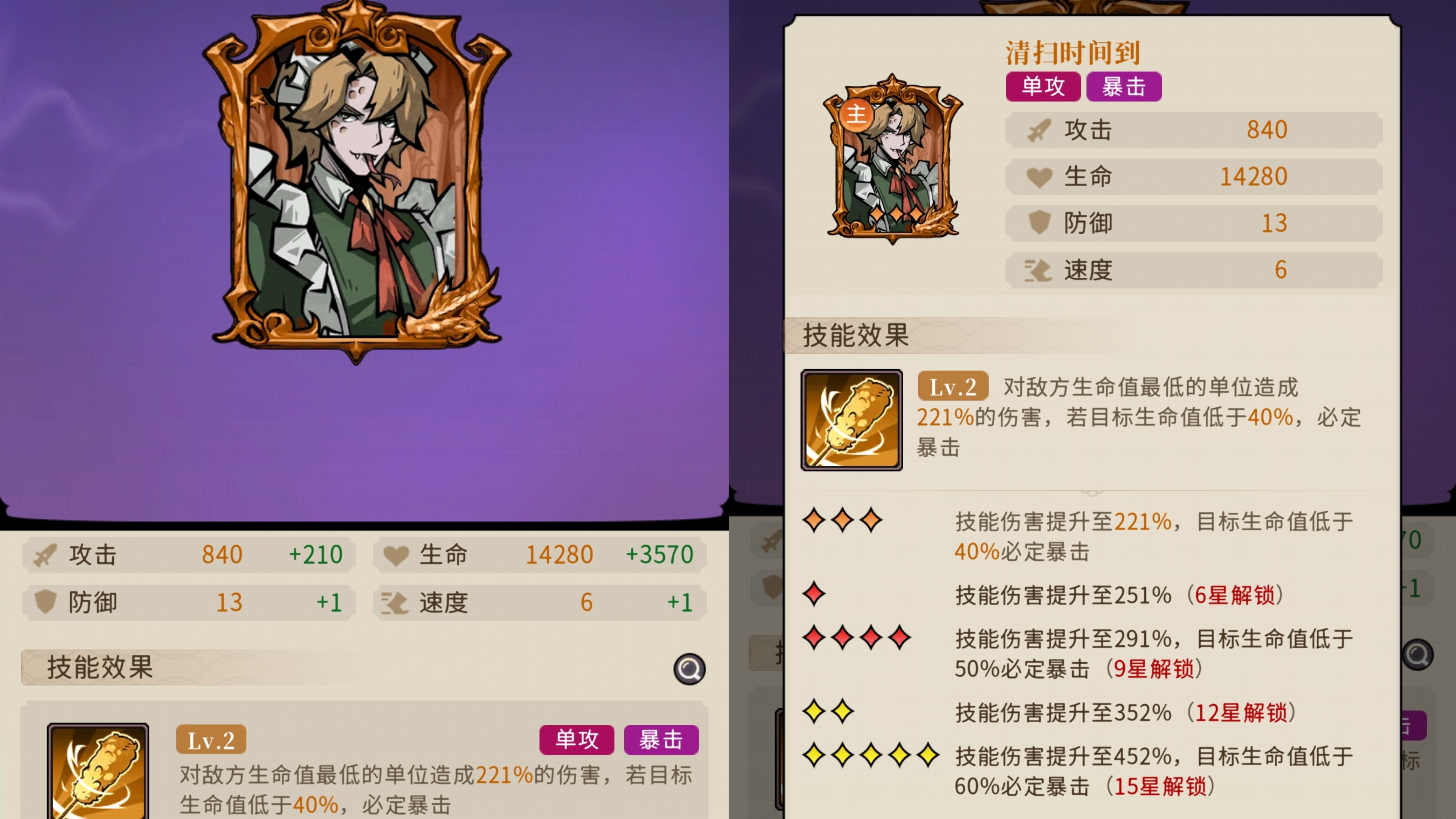 对生命最低的敌人造成伤害,满星情况下最大可以造成452%伤害,同时只要目标生命低于60%必定暴击。