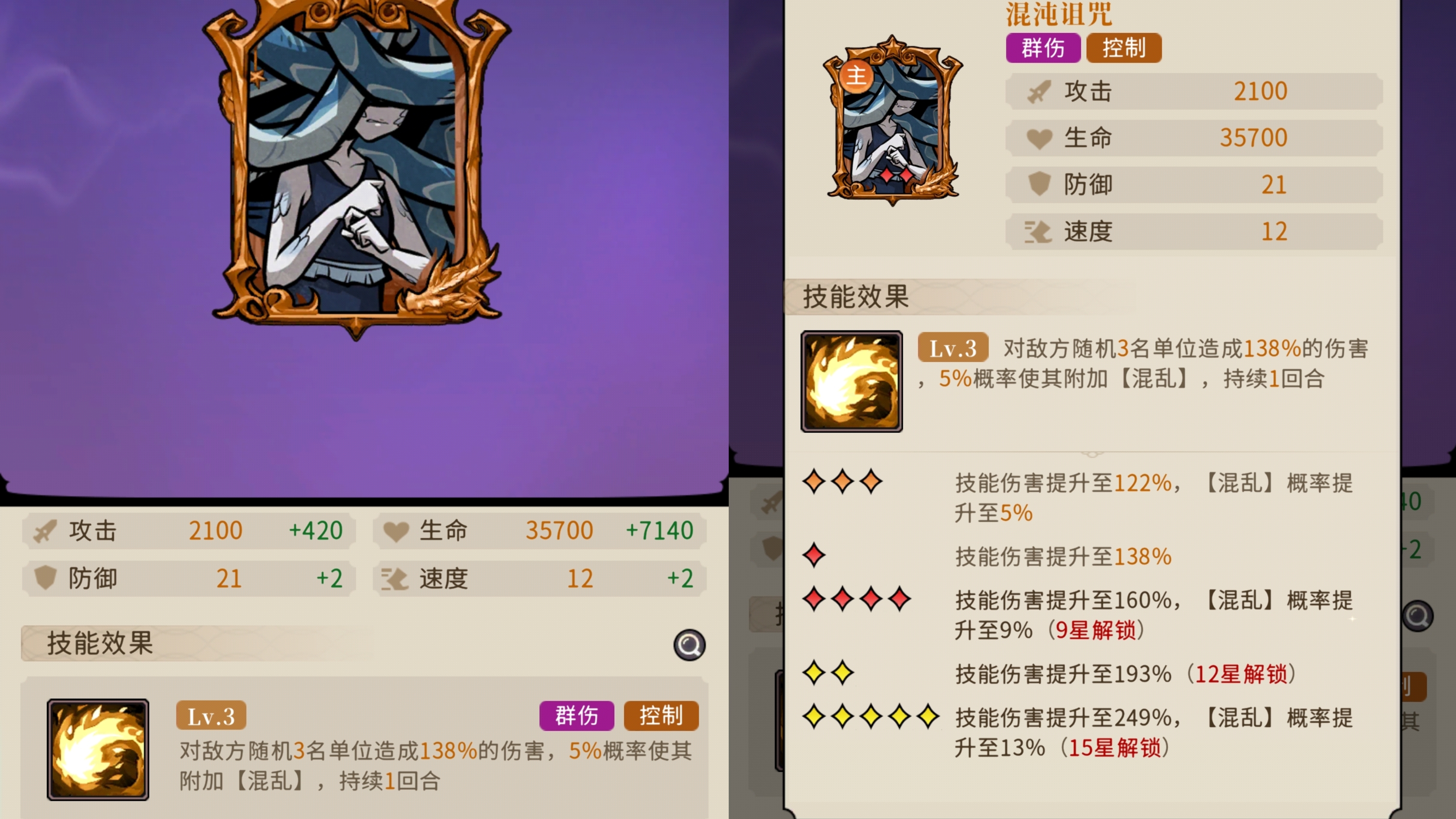 随机对3名敌人造成伤害+混沌,满星情况下伤害249%倍率+13%的混乱概率。