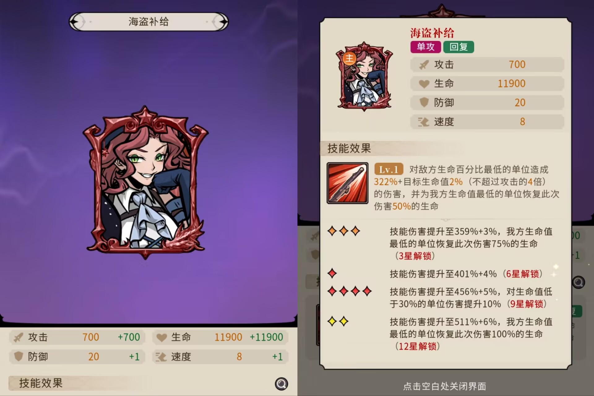 给我放两名残血队友回血,满星情况下治疗量可以提升到294%,同时可以提升我方主c和副c的15%攻击和伤害。