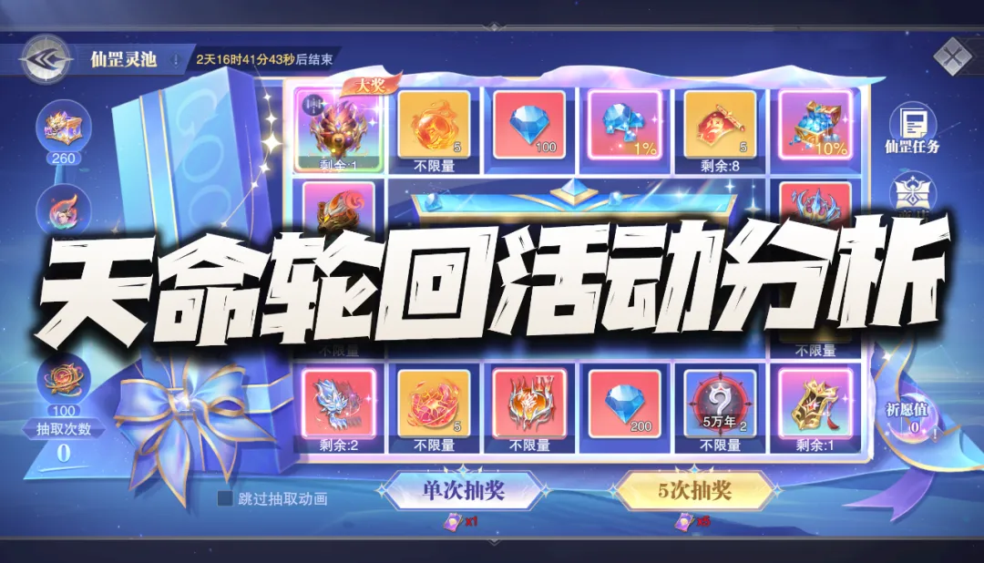 然后这个聚宝灵池活动就没啥更有价值的资源了,而此次系列活动的第二个分支异世幽梦暂时也看不到,所以我们直接来先看第三个天命轮盘活动,这个转盘大家应该也不陌生了,我们得通过各个途径收集到的天命币来进行抽取,其中......比较核心的资源共有3个,分别是: