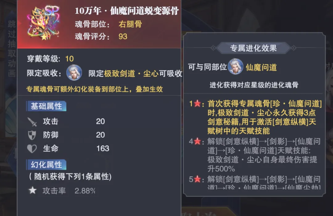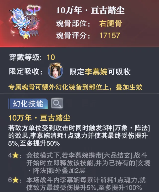 第一个是SP李慕婉的左腿专属魂骨,这块魂骨的理论最高增伤值只有150%,而且还得视条件才能触发,整体意义并非很大,而PVP中则是可以加快1技能的释放频率,但这个1技能本身也是可以在开启条件自动释放的,所以整体而言这块需要260抽才能保底获取的专属魂骨......性价比还是不太行。