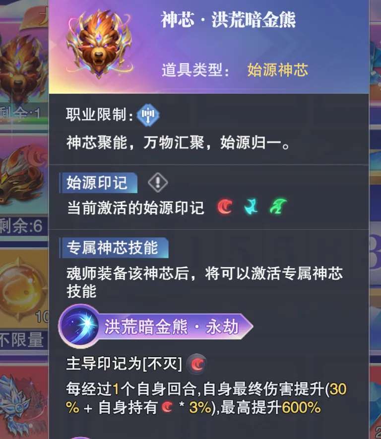 接着第二个奖励则是洪荒暗金熊的始源神芯,需要440抽才能保底获取,那么按照此次池子的综合参与性价比而言,这个440抽的特等奖也没有特别大的获取意义,当然运气特别好的欧皇朋友就除外了,其可以大幅提升始源印记的泛用性,并且三个方向都可以实现更高或者是更快的增伤效果,契合于长图、短图和PVP的各类需要,属于锦上添花类的资源,大佬专属了。