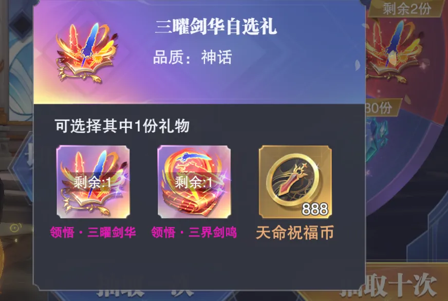 接着第二个资源则是转盘中0.6%概率可以抽到,依然是无保底的三曜剑华自选,这两个三曜剑华是可以在天赋树中进一步提升SP+尘心长图或PVP输出的资源,但其并非是天赋书的最终分支,同时这波也是属于返场,大家碰碰运气即可......因为非特等奖不给保底的话,按照这个概率真心还是太考验人品了。