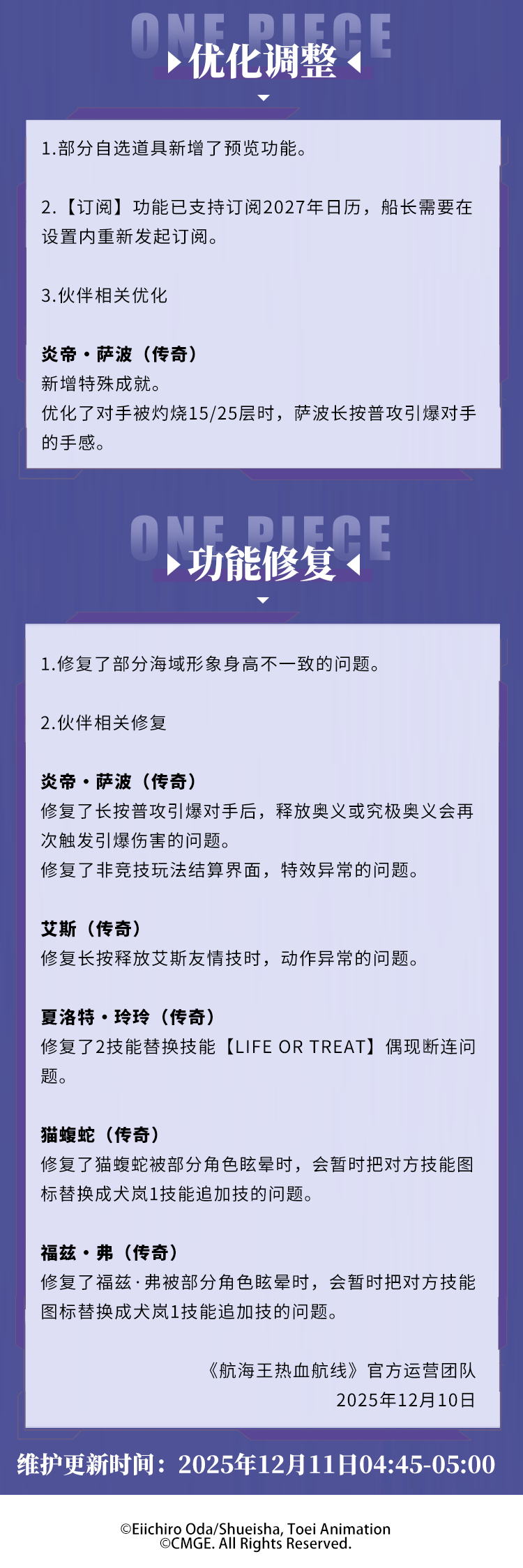 第二届顶尖决战开启!12月11日不停服更新公告光环小G发布于 12-11关注⭐巅峰赛第二届开启!12月11日不停服更新公告⭐为了各位船长旅途更丰富、航行更平稳,《航海王热血航线》将于2025年12月11日4:45-5:00间进行不停服更新,如遇无法登录游戏、强制下线、无法进入战斗等情况,重启游戏客户端并等待更新完成后即可进入游戏、正常游玩。↓↓↓更新详情如下↓↓↓