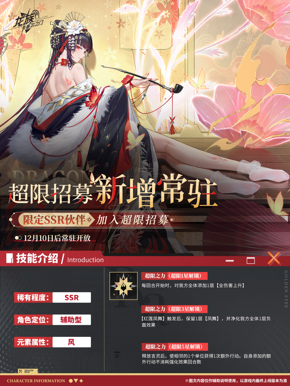 超限招募丨新增常驻伙伴「龙马樱井小暮」光环小G发布于 12-11关注亲爱的专员,全新限定SSR伙伴「龙马樱井小暮」即将于12月10日加入超限招募!活动期间,每日登录游戏即可免费领取「超限招募券」,解锁高级奖励即可获得全新头像框「化蝶」!超限招募达到指定次数即可直接领取龙马樱井小暮全新皮肤「彼岸红莲」!同时,「龙马樱井小暮」可超限觉醒至MR品质!“坦然些吧,末日总会到来。”更多皮肤详情,敬请关注官方后续公告。