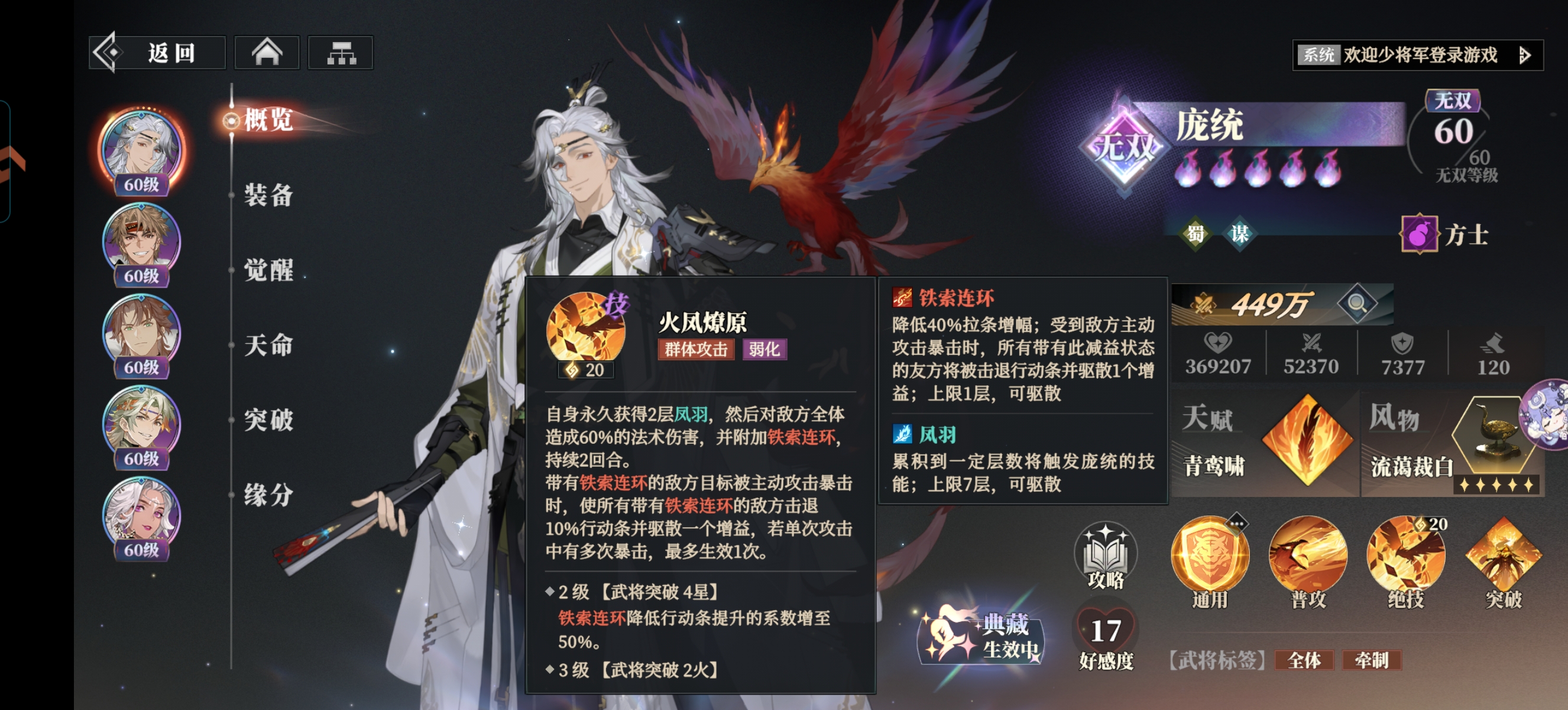 3:详细解析:①庞统:起手给全体敌人挂铁索连环,配合祝融暴击打出全体推条,打断敌方的行动节奏。