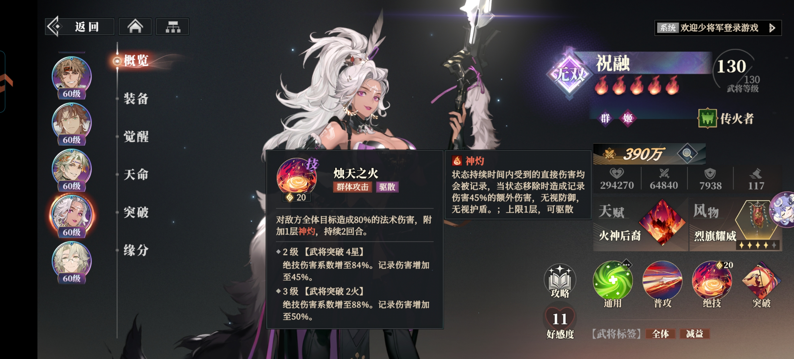 ③祝融:阵容核心辅助,必须5火!开局直接给全体敌人挂【神灼】和【怒焰】。