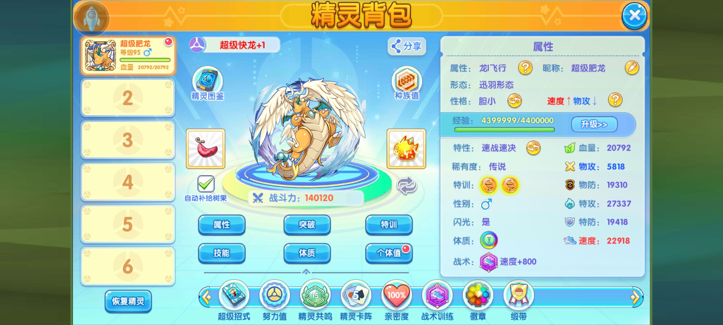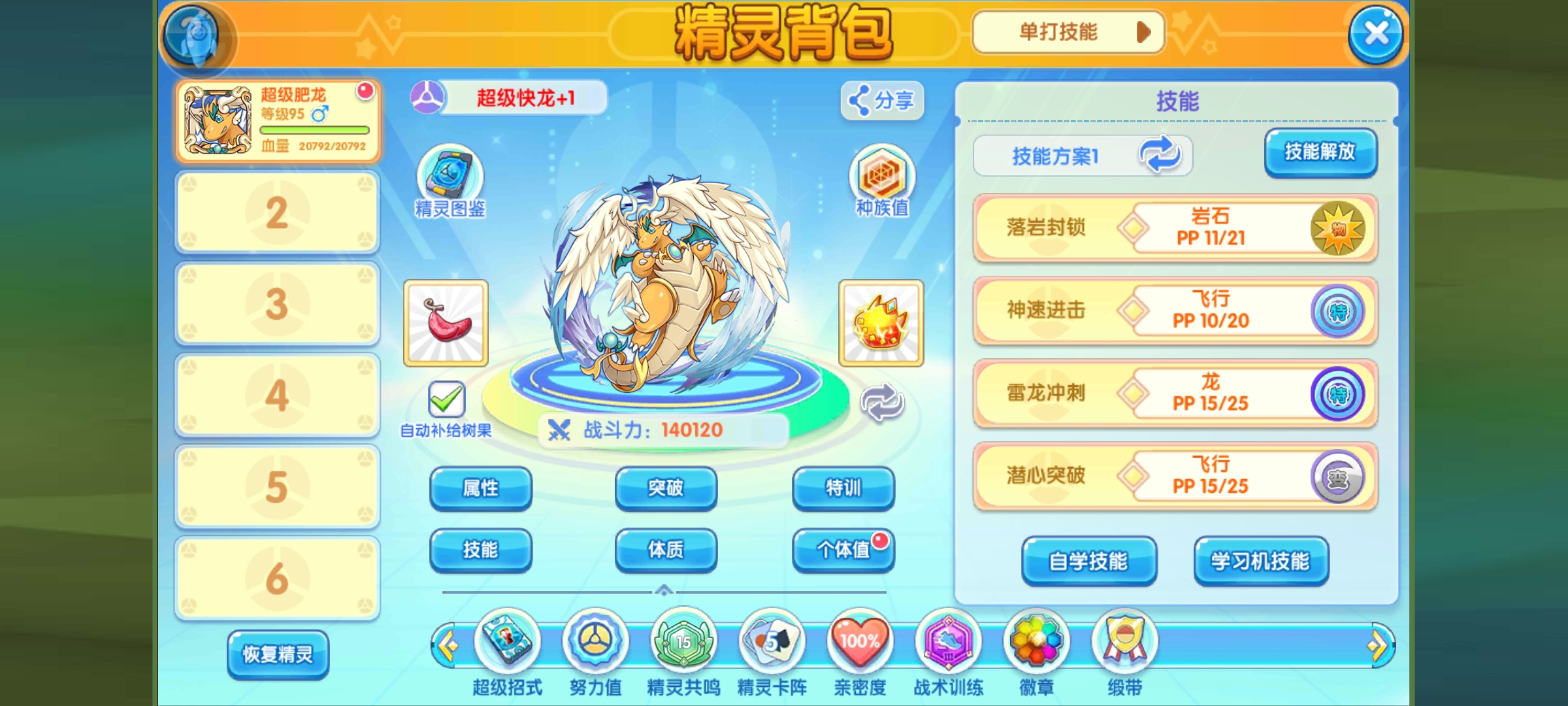 分析:这套主要以输出为主,偏向爆破,依靠特性的增伤,击杀一些脆皮宠物,如盖洛赛克特这些,潜心作为回复技能可以带,神速进击作为强化的技能,第三个技能也是可以作为龙本,推荐雷龙或者霜炎,以输出为主,这两个作为本系输出都不错,神速进击配合特性,可以快速增加速度叠加伤害,然后第4个技能可以选高威力的技能,推荐落岩封锁/高压电网/烈焰火爆/环形水流都可以,根据自己队伍选择搭配。它玩法以强化输出为主,不要小看新快龙伤害,特攻和速度叠加的话新快龙可以秒很多脆皮宠,而且不怕空间等限制,必定先手。然后强化技能神速进击还兼顾输出,一来可以增加速度状态,二来还可以加速度从而提升特攻,新快龙的速度不低,如果胆小性格,努力值选择加速度的话,基本就是先手,输出伤害也是不低的。