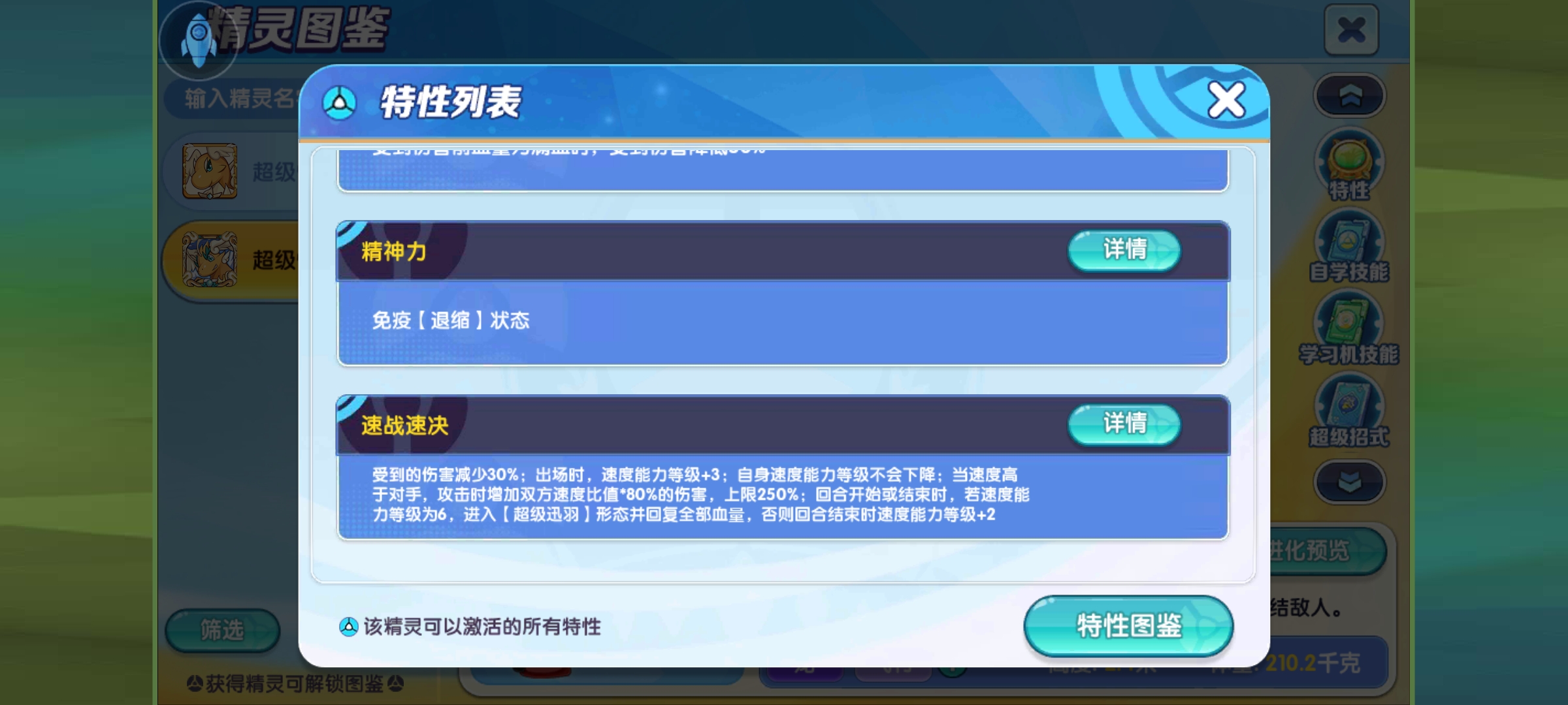新快龙特性有4个,有3个老特性和1个新特性,今天主要讲新特性速战速决,效果是出场时,速度等级+3:自身速度能力等级不会下降:当速度高于对手,攻击时增加双方速度比值80%的伤害,上限250%:受到的伤害降低36%:回合开始或结束时,若速度衡力等级为6时,进入【迅羽】形态并回复全部血量,否则速度能力等级+2。