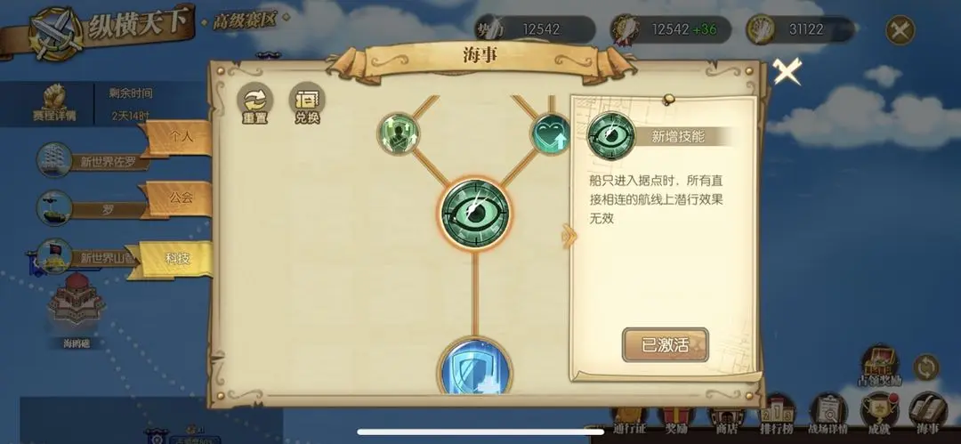 【个人科技树】将不仅可以为船长们在纵横天下海战中增加攻击、防御、血量、速度等基础数值,升级至一定等级还将强化某些船只在纵横天下海战中的技能!例如罗的潜水艇解锁强化后,将可以提升潜行次数!