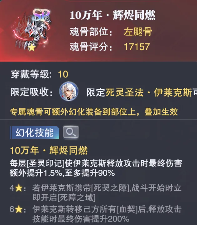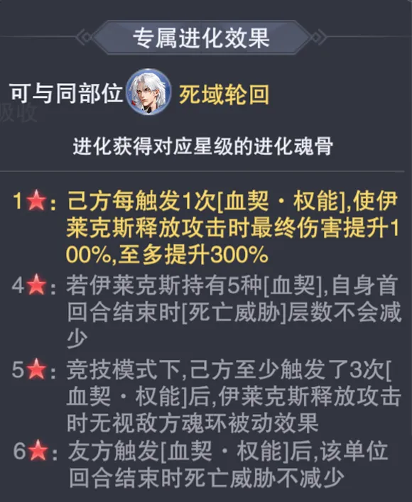 所以初看到这个成本大家以为如何呢?当然这两项此次活动上线的核心资源也没这么简单,接着咱们就来说一说其中的逻辑。首先是伊莱克斯全新的左腿专属魂骨,这块魂骨最大的意义并非是两个增伤效果,而是可以让4-2技能的这个领域提前释放,而这个4-2技能则是伊莱克斯在PVP战斗中的一个核心技能,那么在官方的设计中,其实4-1技能自带的领域就是可以“先机”释放的,而4-2技能的领域先机效果则显然就给放到了这块魂骨当中来作为售后资源存在。所以有了4-2技能的先机领域后,伊莱克斯相当于就可以节约一次开领域的回合时间,借此便能更快的实现被动输出的暖机工作和更快的实现高效率的“血契”转移功能,而目前PVP的战斗大部分还是需要抢一定的先手,先行动的一方明显有巨大的优势,因此我们想要伊莱克斯在PVP中能有更强的发挥,这个涉及到机制变化的魂骨显然比那些数值魂骨要重要的多。然后最为重要的则是此次活动的特等奖,伊莱克斯的右臂进化魂骨,这块魂骨和刚刚介绍的左腿专属魂骨一致,都是一块机制价值远远大于数值提升的魂骨,其最大的核心意义就在于红4星和红6星提供的符合条件下的“死亡威胁”不会降低的效果。其中红4星是给到了伊莱克斯相当于更多的出手机会,而红6星这个效果才是关键,毕竟之前咱们也实测过,伊莱克斯在特定的技能搭配下,甚至是理论上更适合长图的结果搭配下,如果我们把血契的承担只能给到队友,那么很有可能队友就会在长图中打着打着就挂了......这个问题也是困扰着很多想用伊莱克斯打长图朋友们的一大核心问题。而在有了这块进化魂骨后,只要符合条件,那么友方就不会在战斗中莫名死亡了,所以这种机制上的改变......真的就算是其最大的意义所在了。不过嘛反过来咱们也可以想想,如上次文章中有位朋友的留言就说的比较在理,其实伊莱克斯是不是本身就不需要设置这种自身或友方可能死亡的机制呢?那么设置这个机制的原因是否就是为了给后续的售后铺路呢?要不然上线就没啥缺陷的完美魂师,还需要用售后来补啥呢?所以这个思路其实也是一个值得思考的逻辑,大家可以参考一二,不过不论如何,这种成本的机制改变,注定只有大佬玩家和少部分欧皇朋友能够搞定,绝大部分想玩伊莱克斯的朋友还得继续忍受部分情况下的莫名死亡场景,最后就请大家留言来聊聊自己的看法了吧!