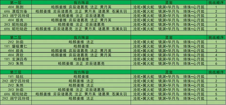 第一队:皓麟姜维(诸葛果羁绊)+陈到(专武)+凛煜刘备(赵云羁绊)+法正(专武+五红)+马良(专武)+苍澜关羽(关平羁绊,放在后排)