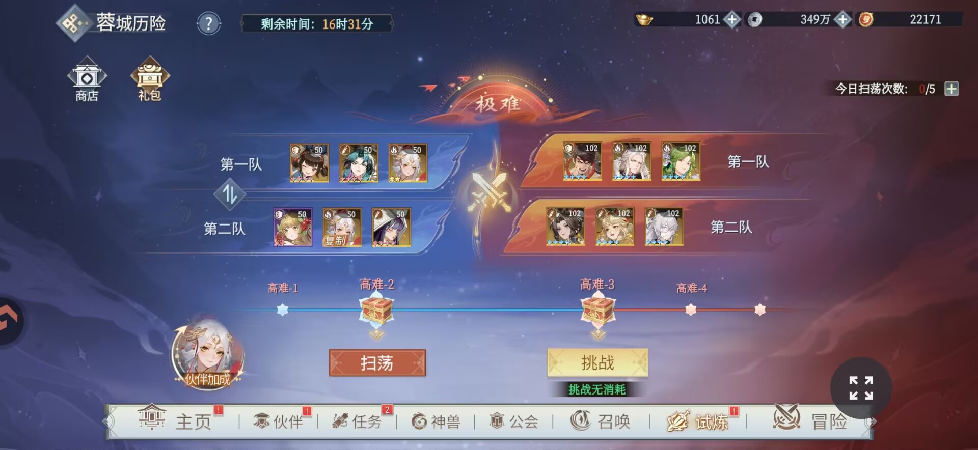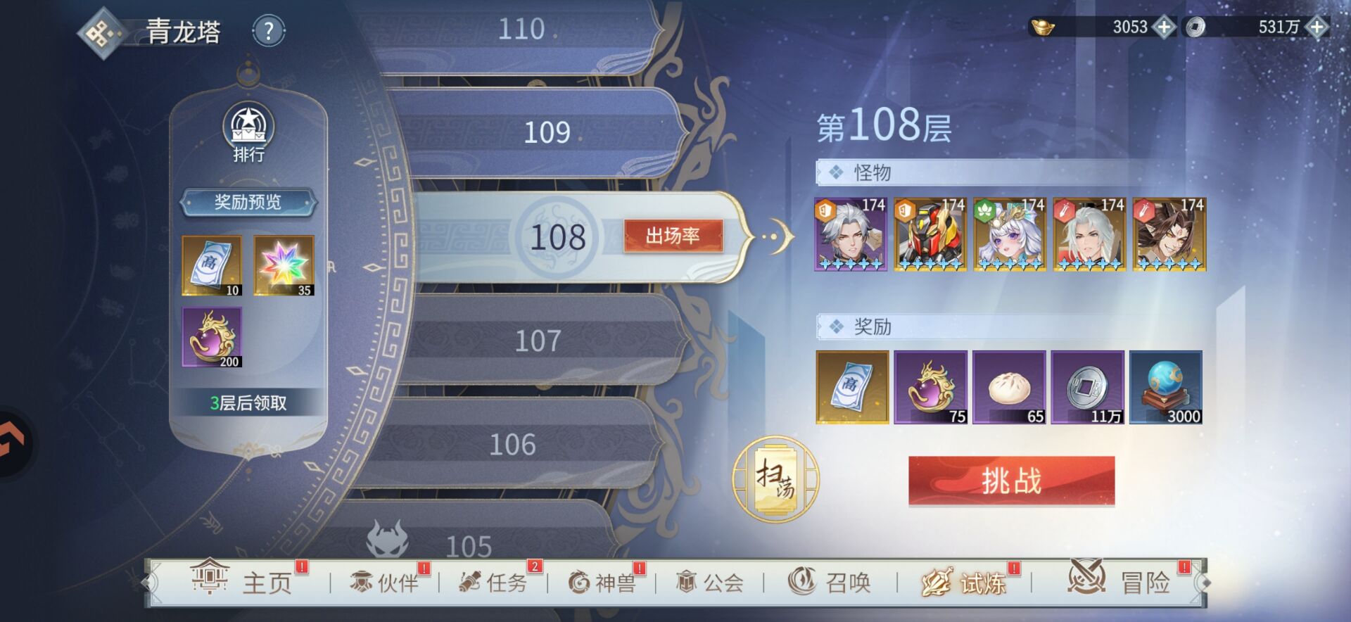 ①【青龙塔】打到自己上限即可,狮子第三天打到了108层。