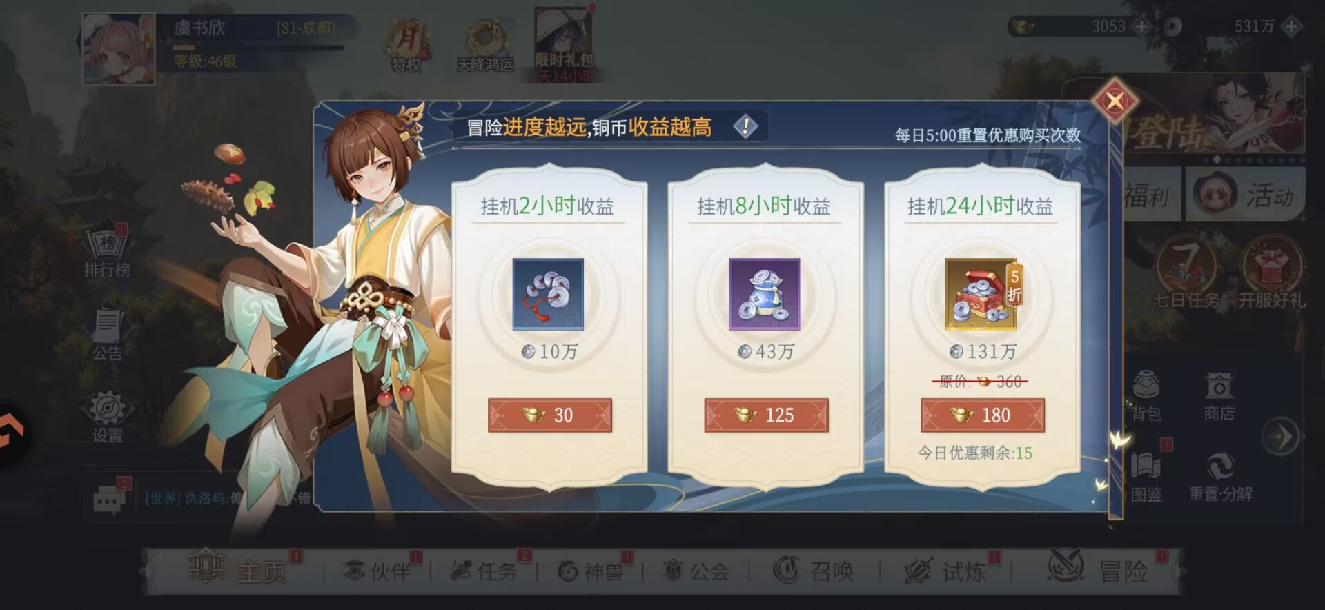 1:【推主线】可以到45级(晚上领了挂机经验可以到47级)