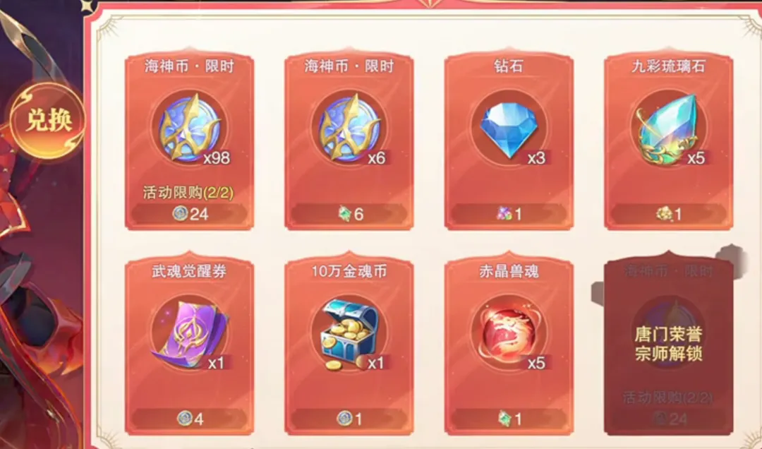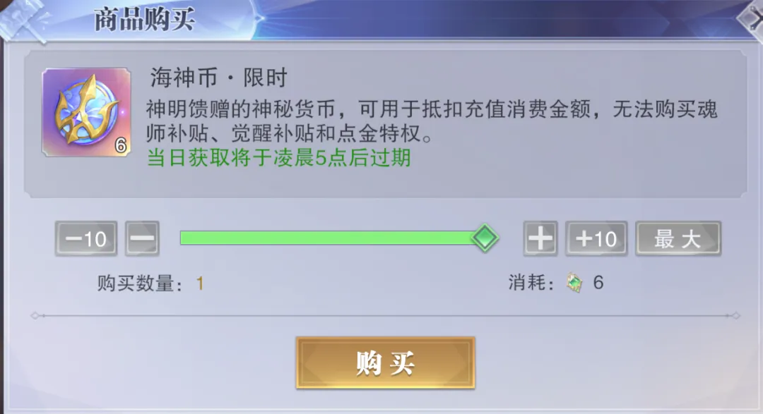这里只需要注意不要有了6个神源玉珏就拿去换6个限时海神币,咱们得等收集到18个后再去一次性兑换,这样才能集齐18元的消费,要不然限时海神币是会在第二天5点过期的,无法凑齐18元消费了。