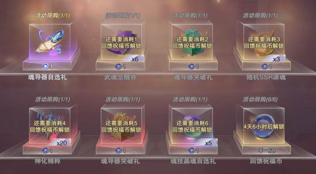 接着凑齐18元消费后咱们就可以在每日任务重获得一个“回馈祝福币”,这个资源便可以在回馈兑换商城进行魂导器及其余资源的一些兑换,反正针对这波可以兑换的魂导器而言嘛,笛子、圆环和百宝囊都算是不错的魂导器,大家可以按需考量。