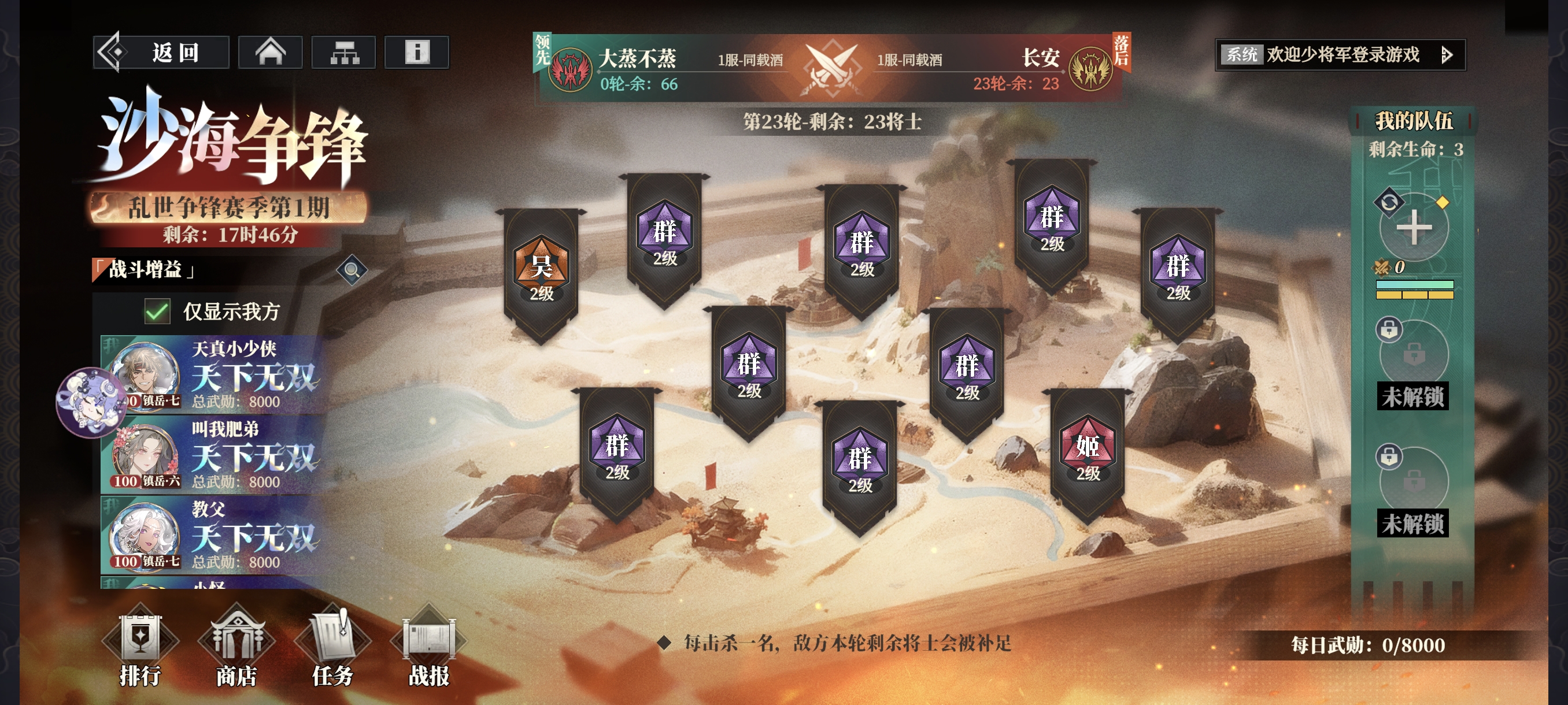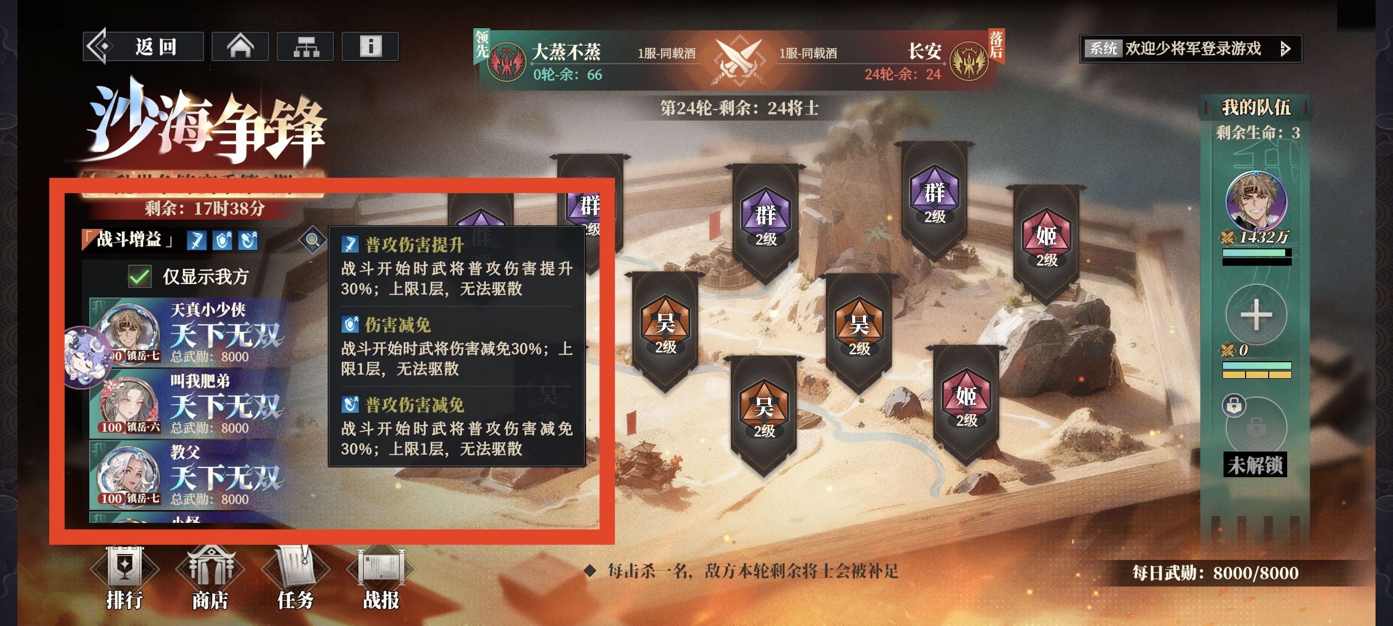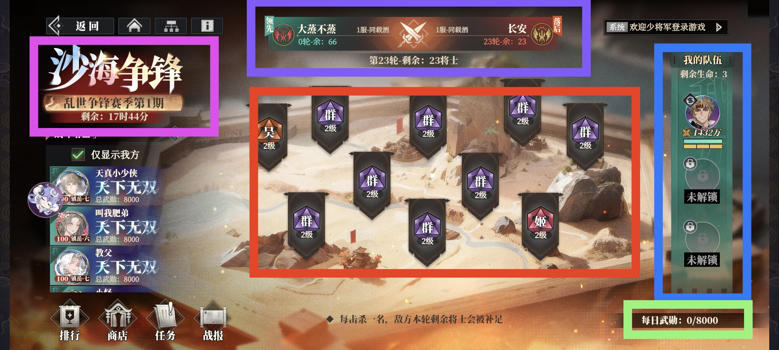 右下角(绿框部分)为每日武勋获取值,上限每天8000,根据战斗场次获得武勋,无论胜负均有。