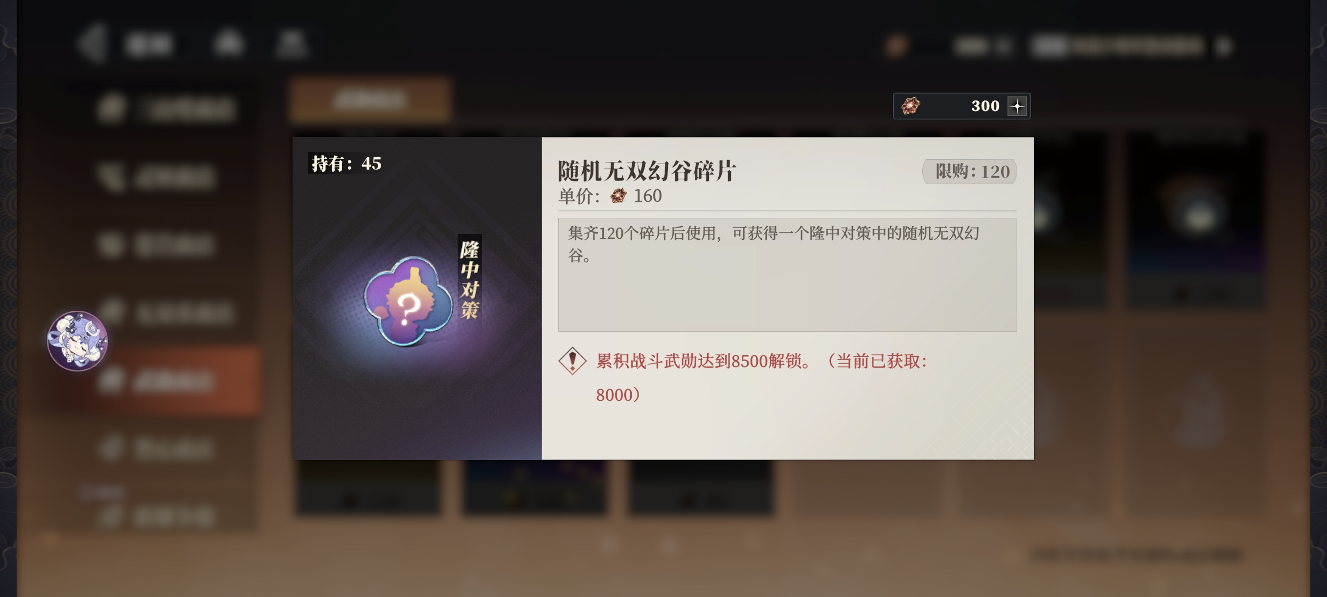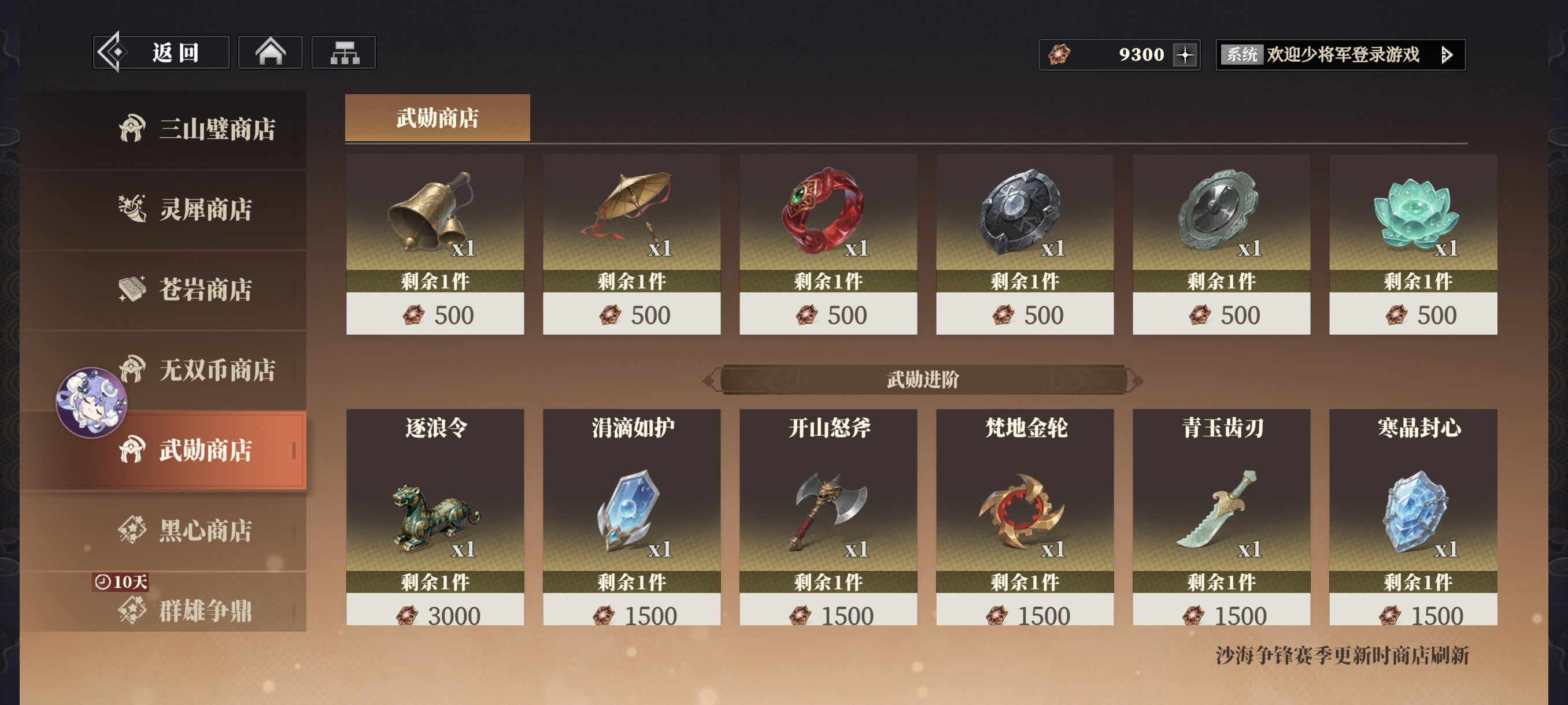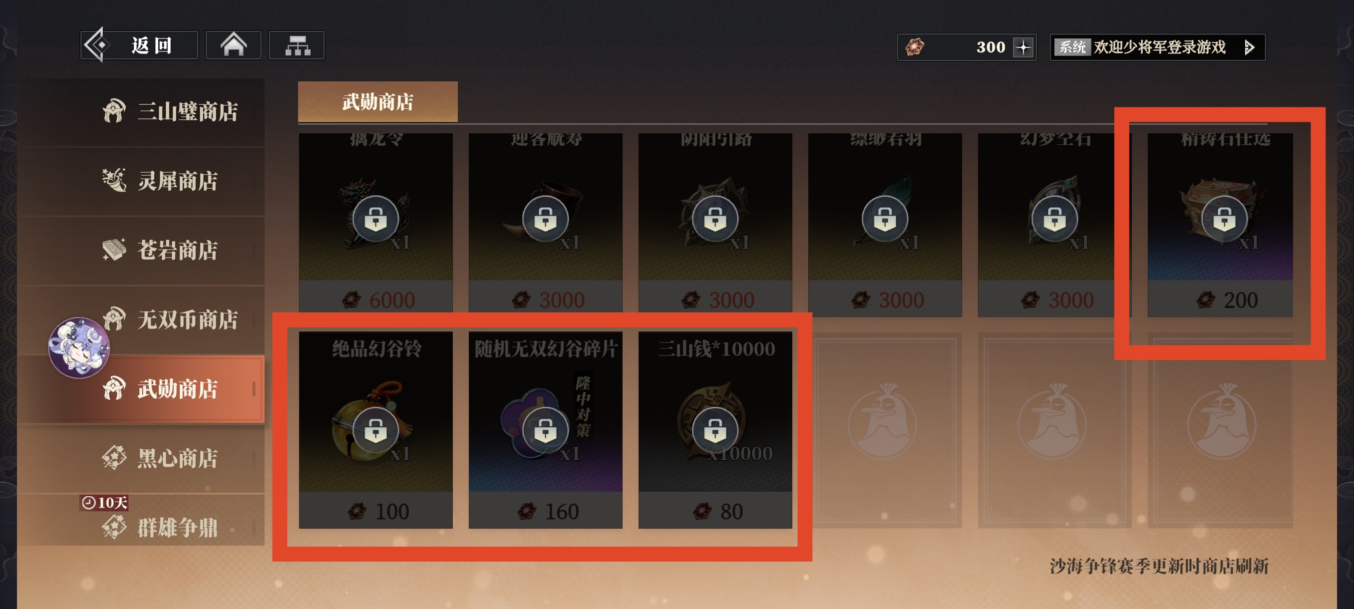 累积获取8500武勋后解锁,可用武勋购买幻谷资源、精铸石、三山钱等养成资源。