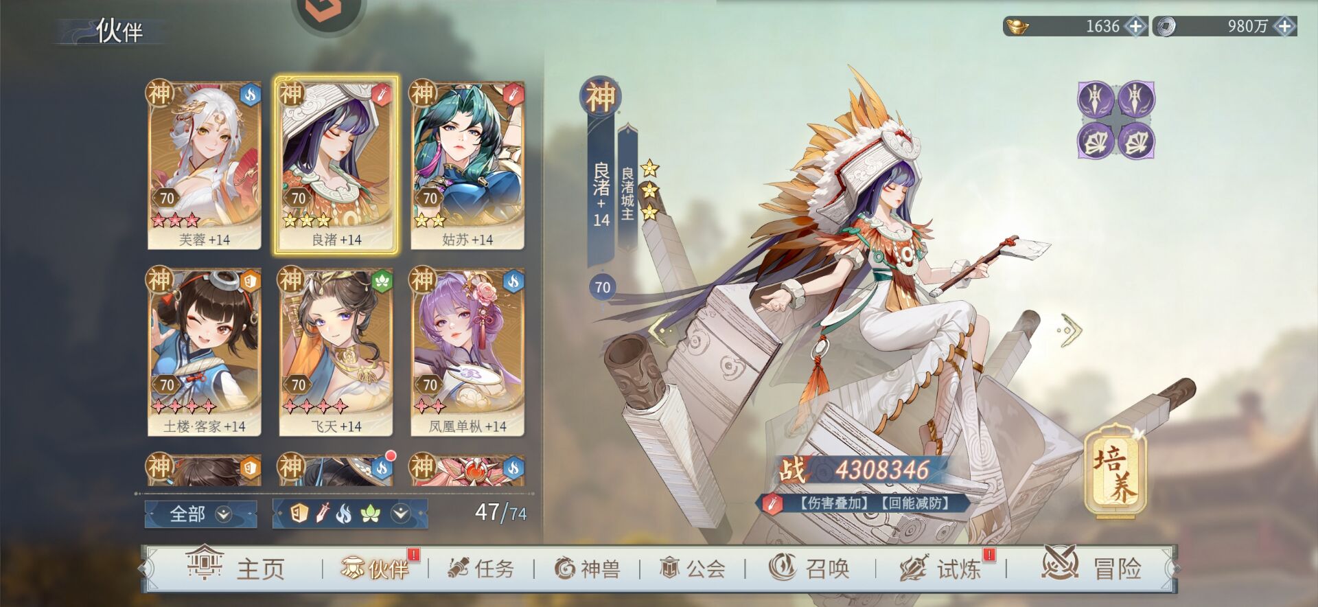 ③菜鸡历练阵容:芙蓉+凤凰+飞天+曦和+邺。伤害为2400万。