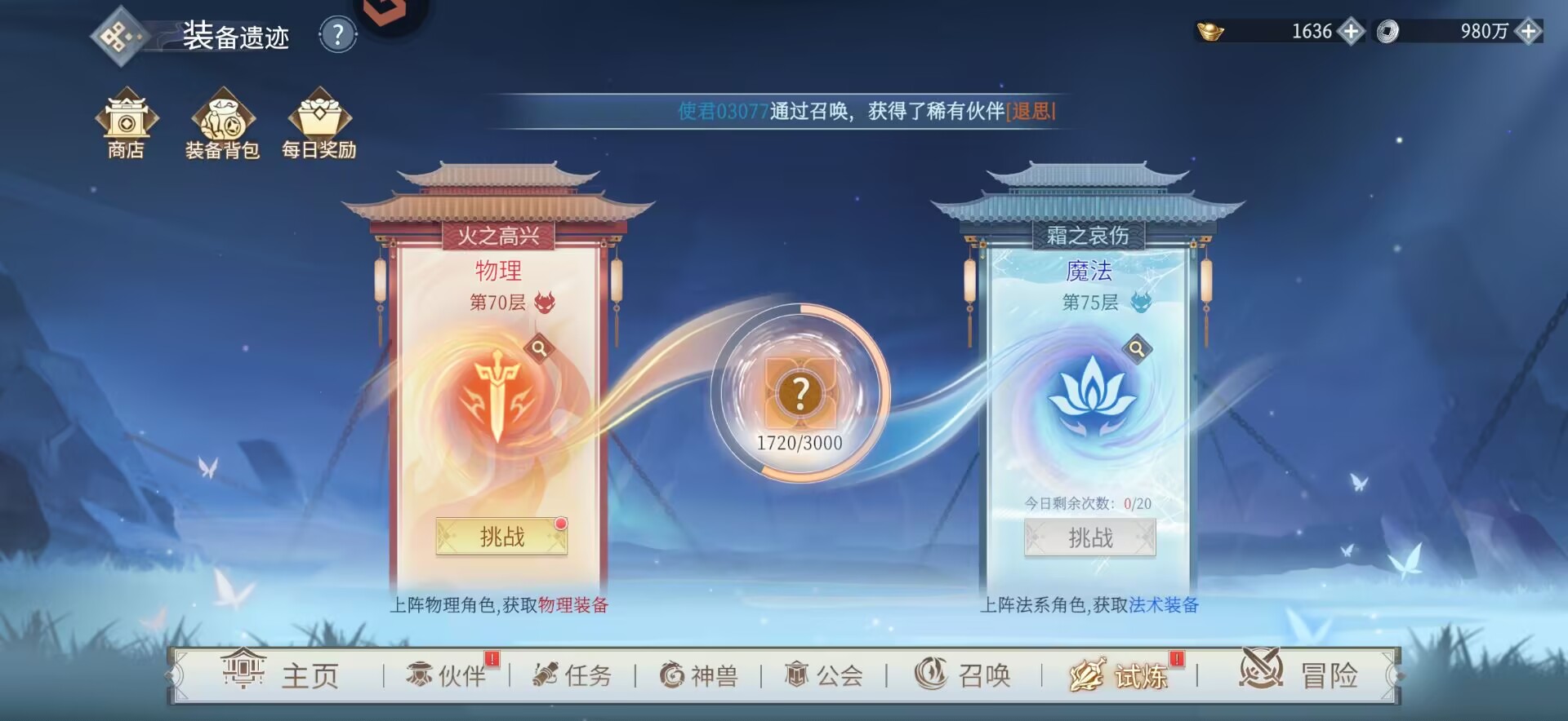 ④装备试炼:物理本70层。魔法本:65层。