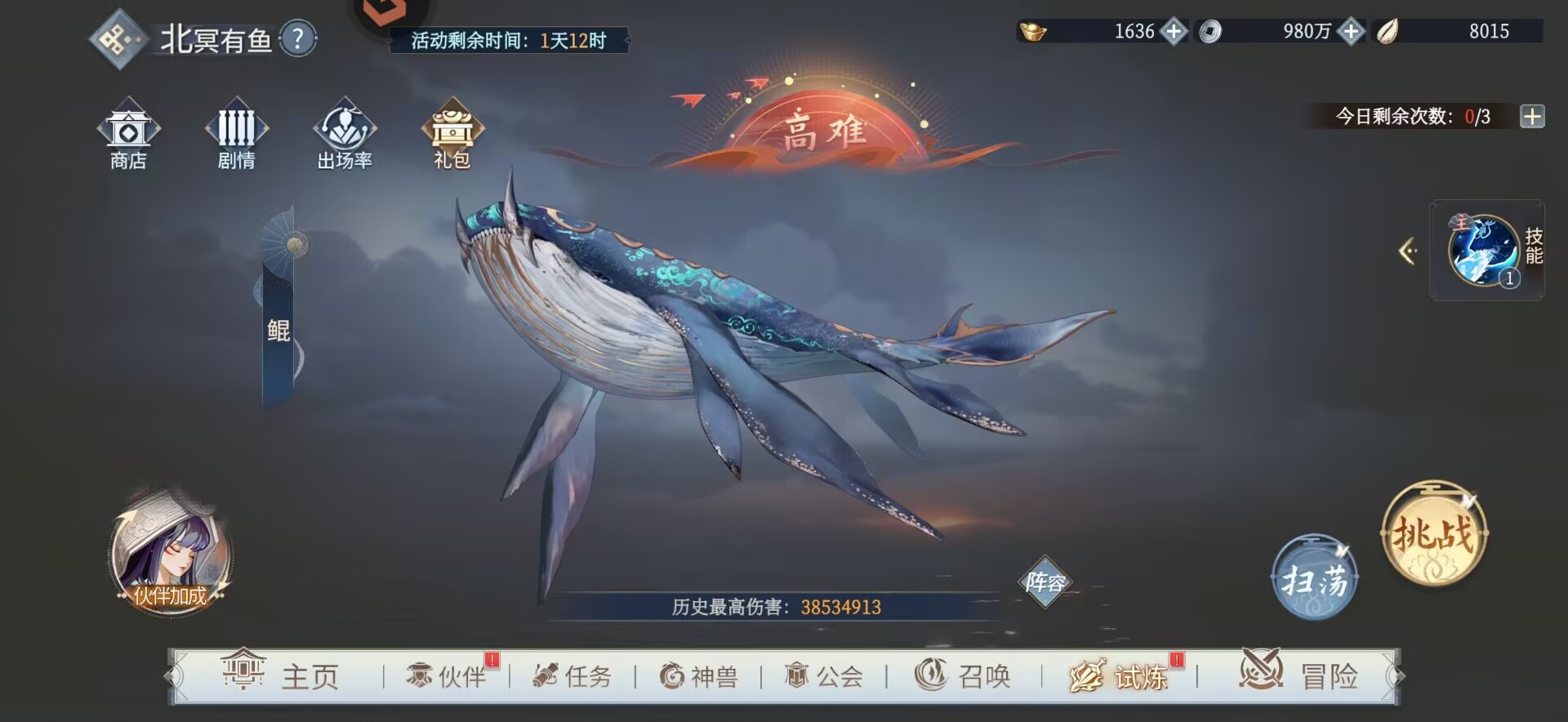 ⑤挑战北冥有鱼和菜鸡试炼(角色提升到70级在去打,尽可能打出伤害最大化奖励才高)