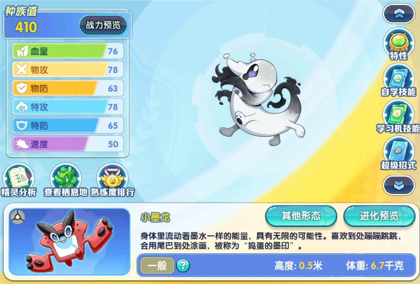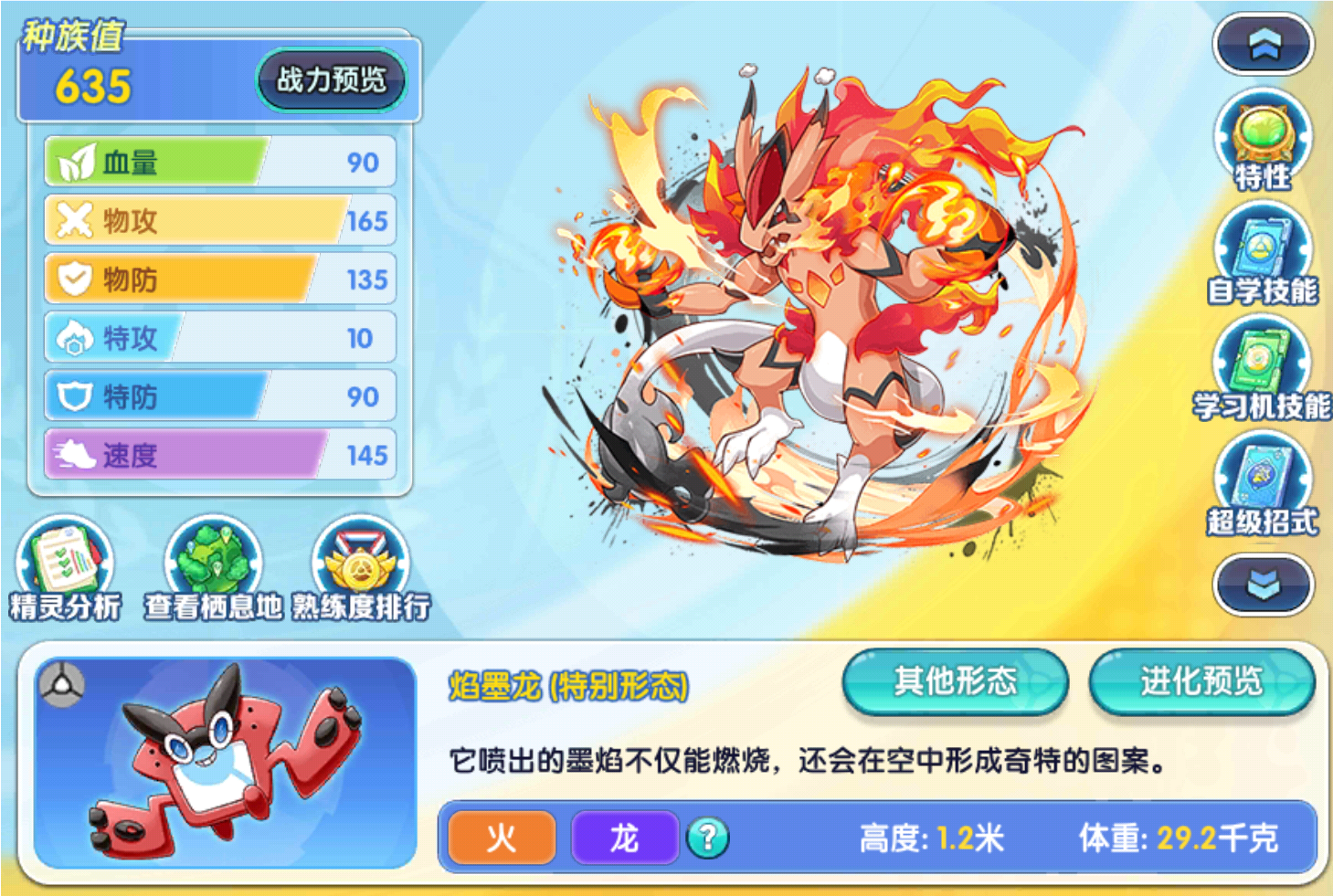 大家可以看到这个就是火龙属性的墨龙是三种进化分支里面伤害最高的一个从种族值分配来看的话,只有165的物攻配置看起来不是特别的高速度的话,是145也不是特别的高,但是可以利用特性弥补这方面的缺点。至于其他种族的话,看了也是白看,没防御没血量。