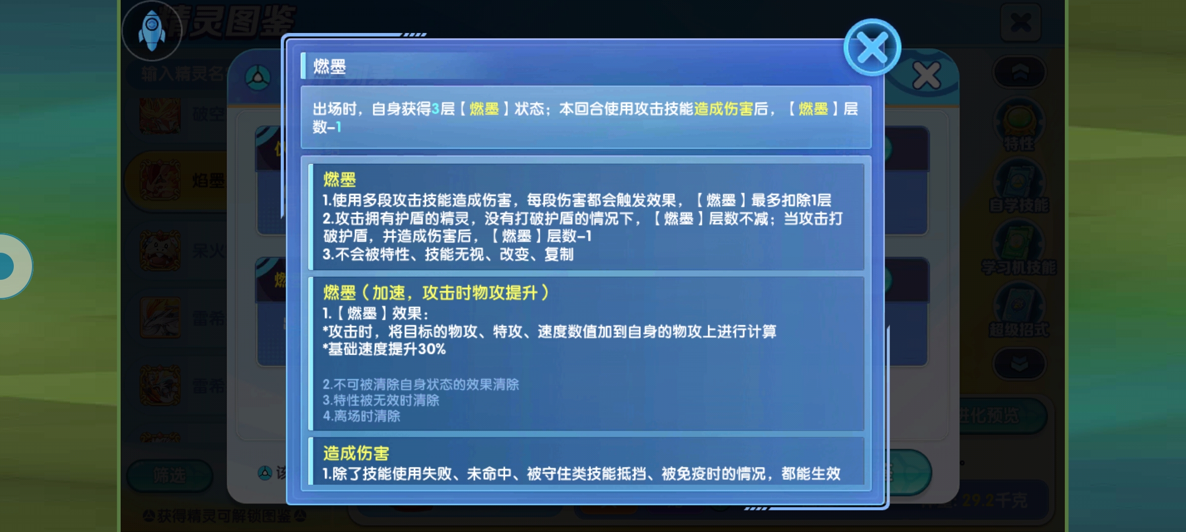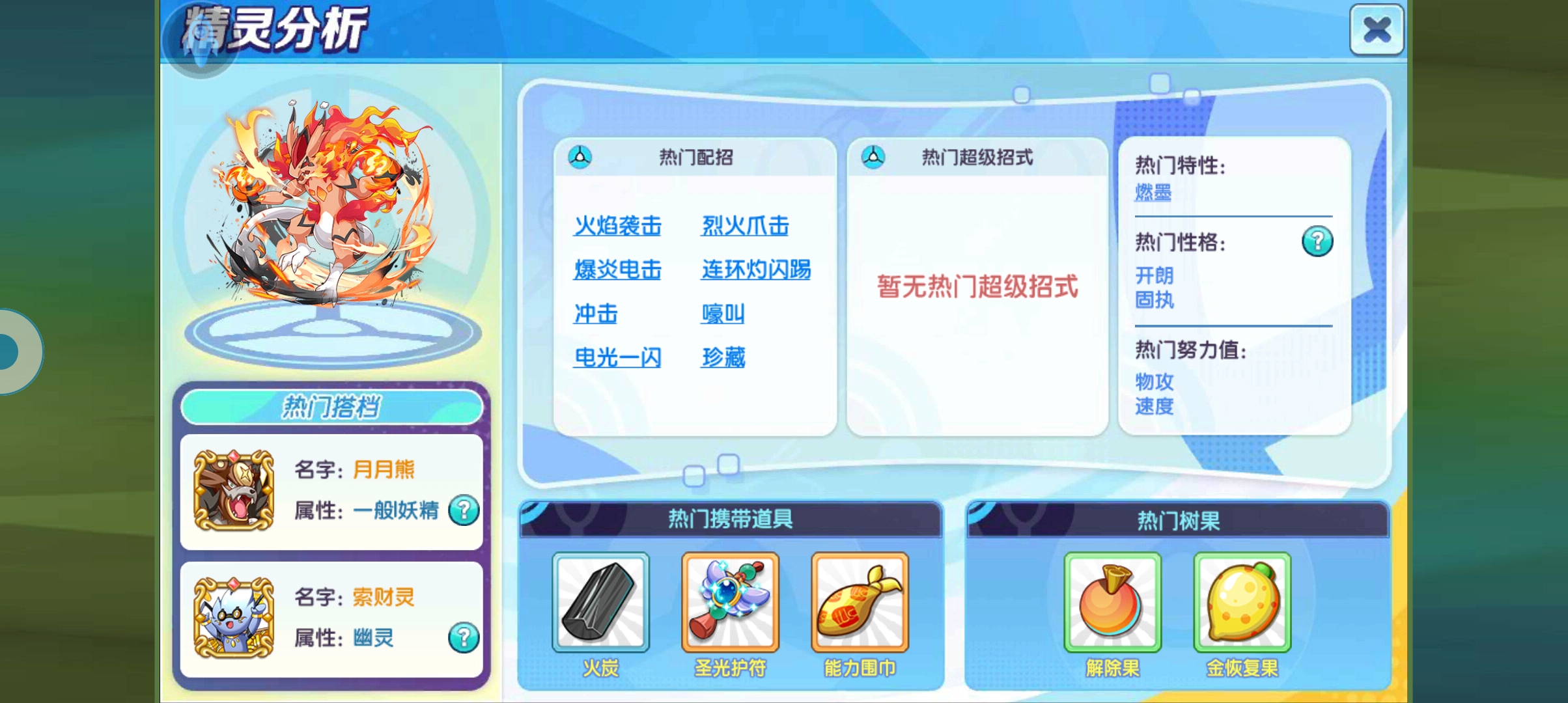 大家可以看到,现在在图鉴里已经可以得到这个技能的配置,非常的简单粗暴,连电光一闪和冲击都有说明这个精灵在前期确实是没有人用的,就是一个过渡类型的精灵那么简单来说,但是这个配件上面的护符就不要想着给这个精灵带了,因为这个精灵不值得使用,除非你有多余的道具盒子能把它给拆掉不然的话给了这只精灵纯纯的就是浪费。
