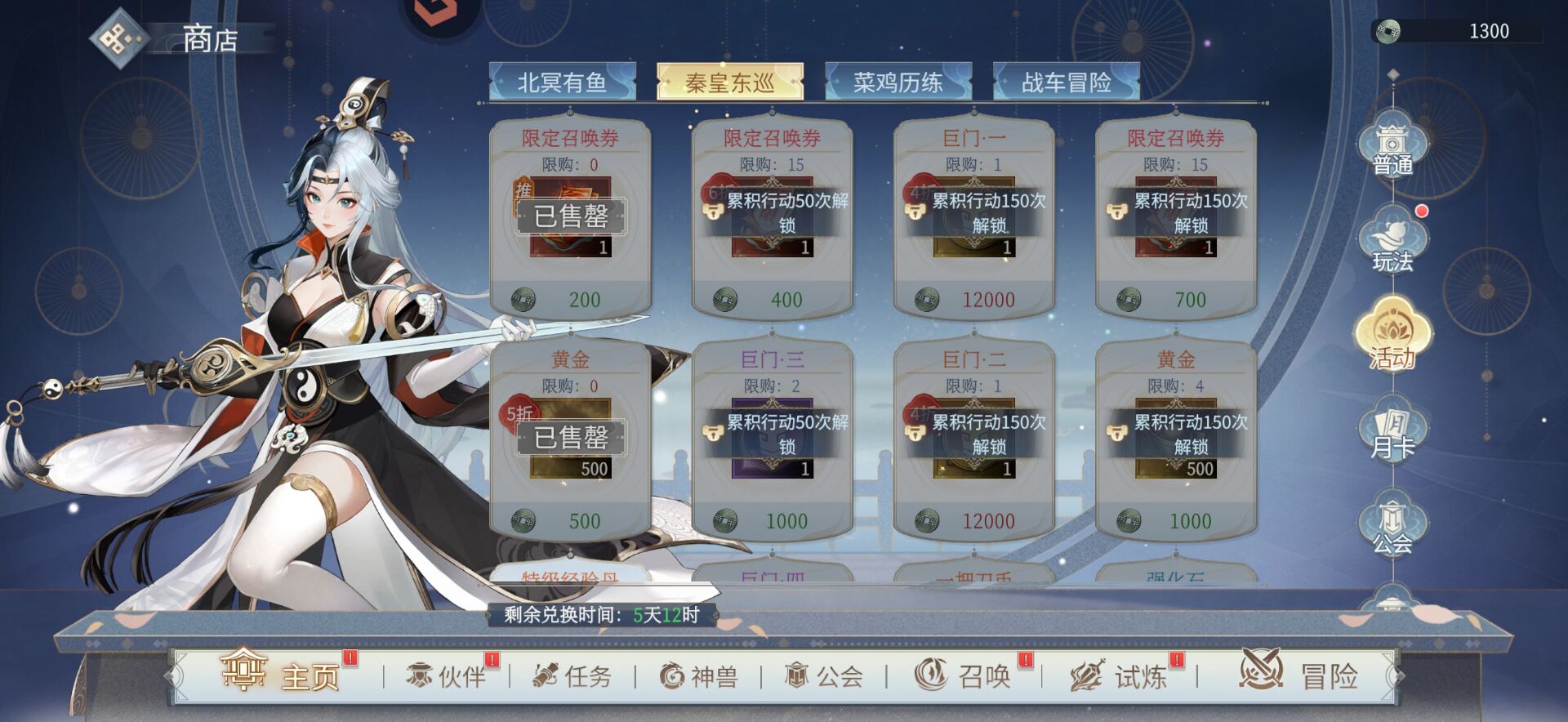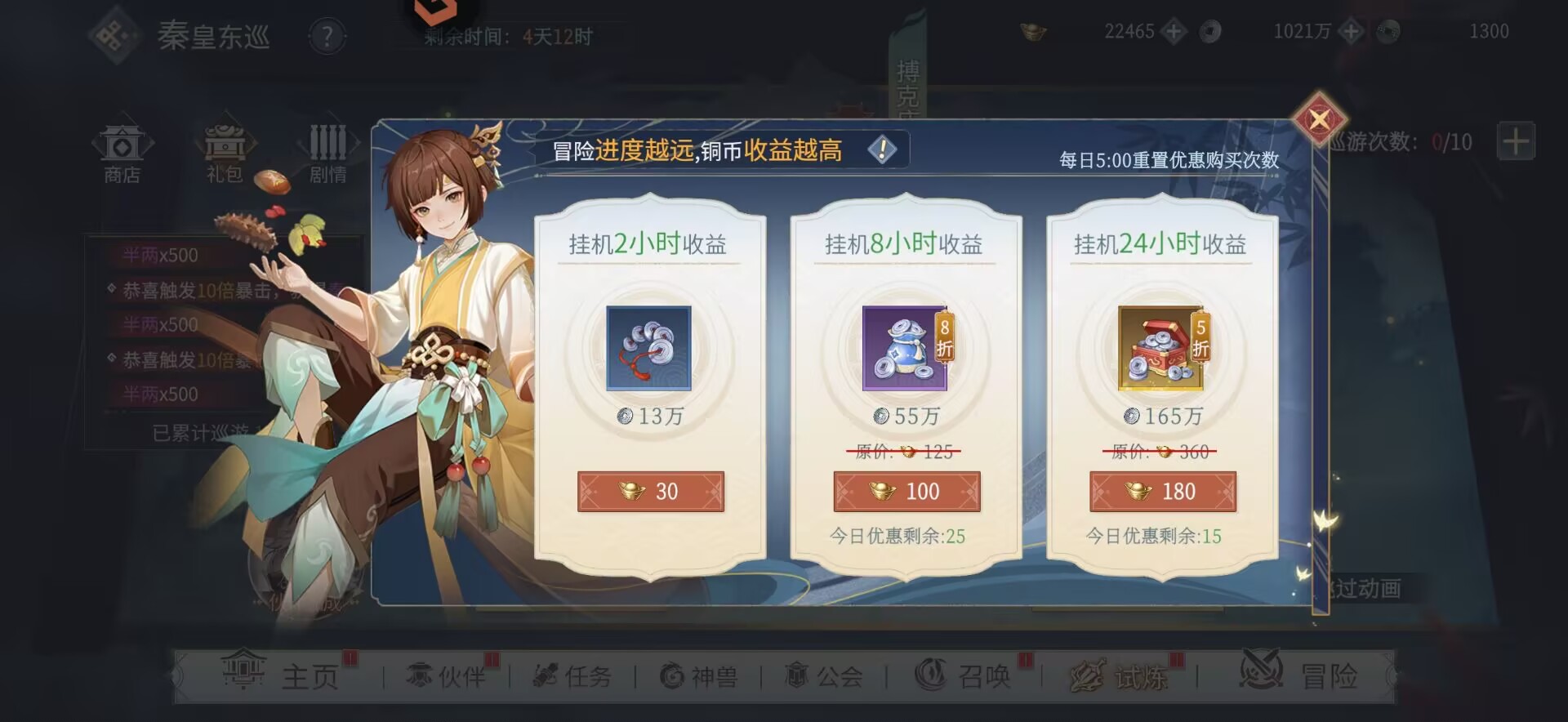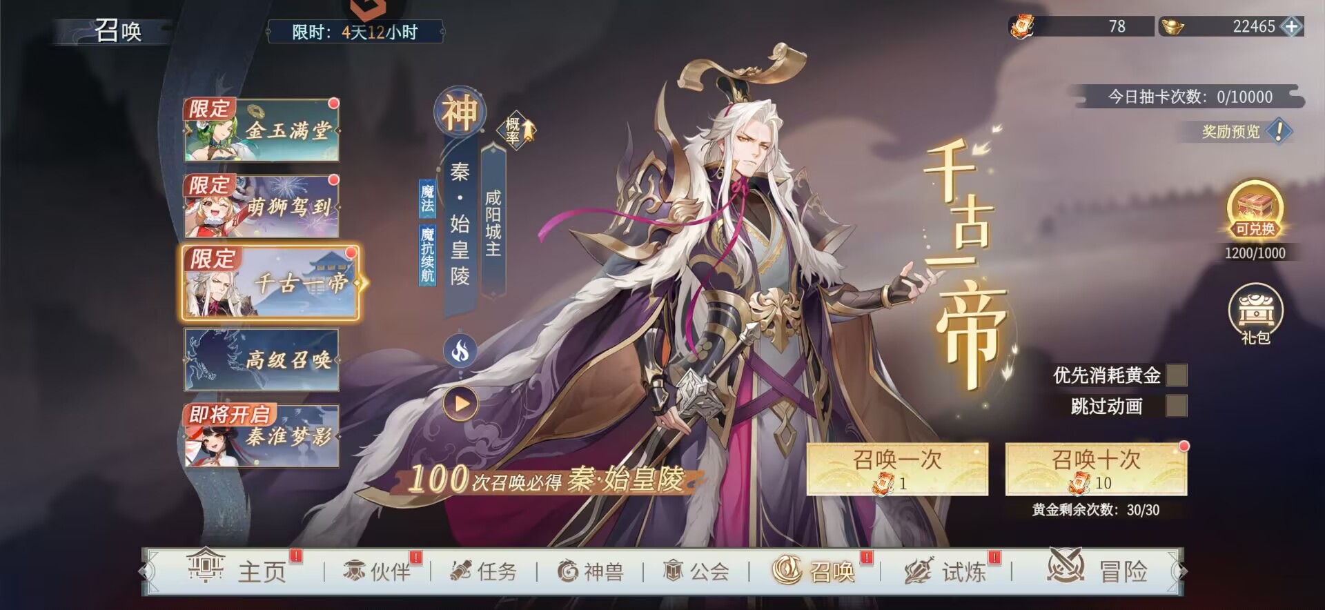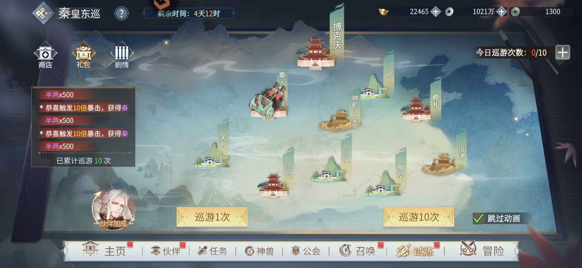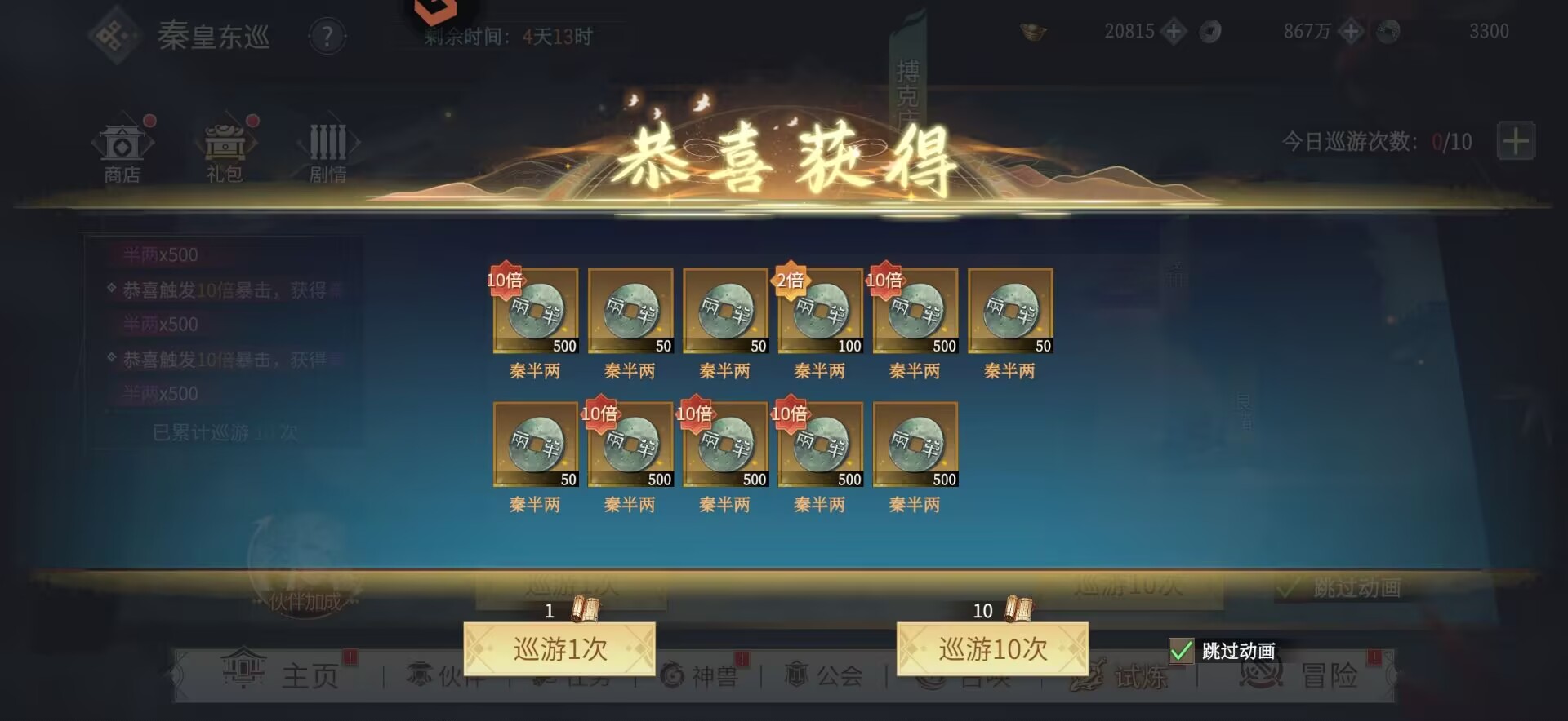 ②每天有免费的10次巡游机会,每天有40次的元宝巡游机会,没有抽秦始皇的玩家不推荐花元宝巡游,或者每天用元宝巡游10次即可。