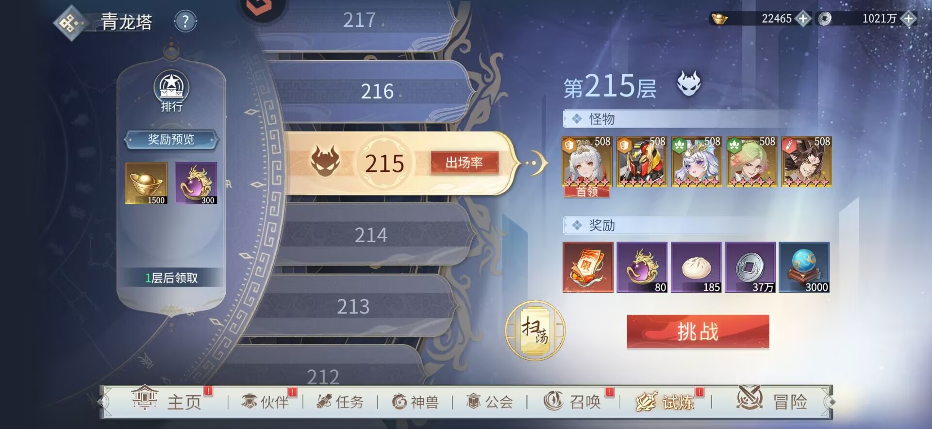 ①青龙塔打到自己上限即可,狮子今天爬到了215层。