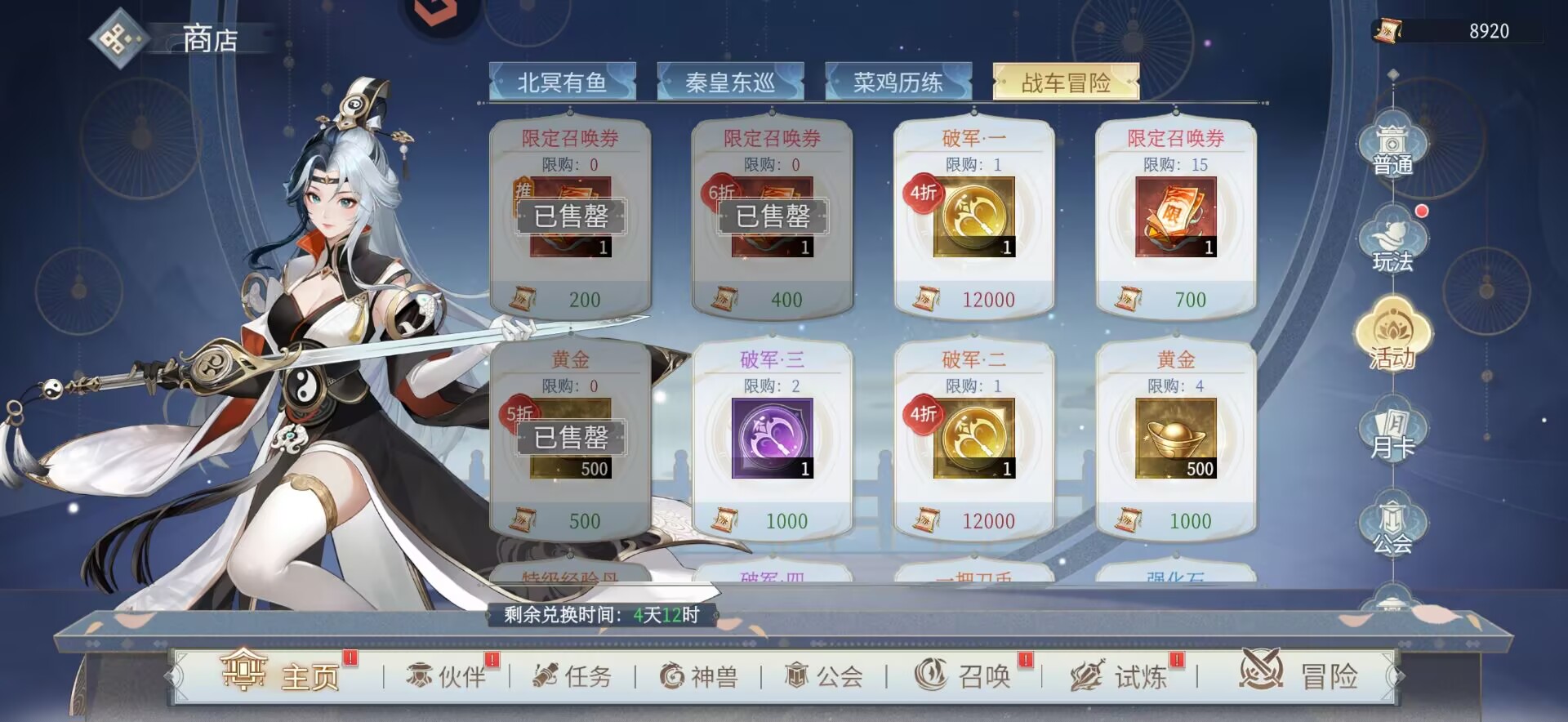 4:打青龙塔+菜鸡试炼+战车冒险。